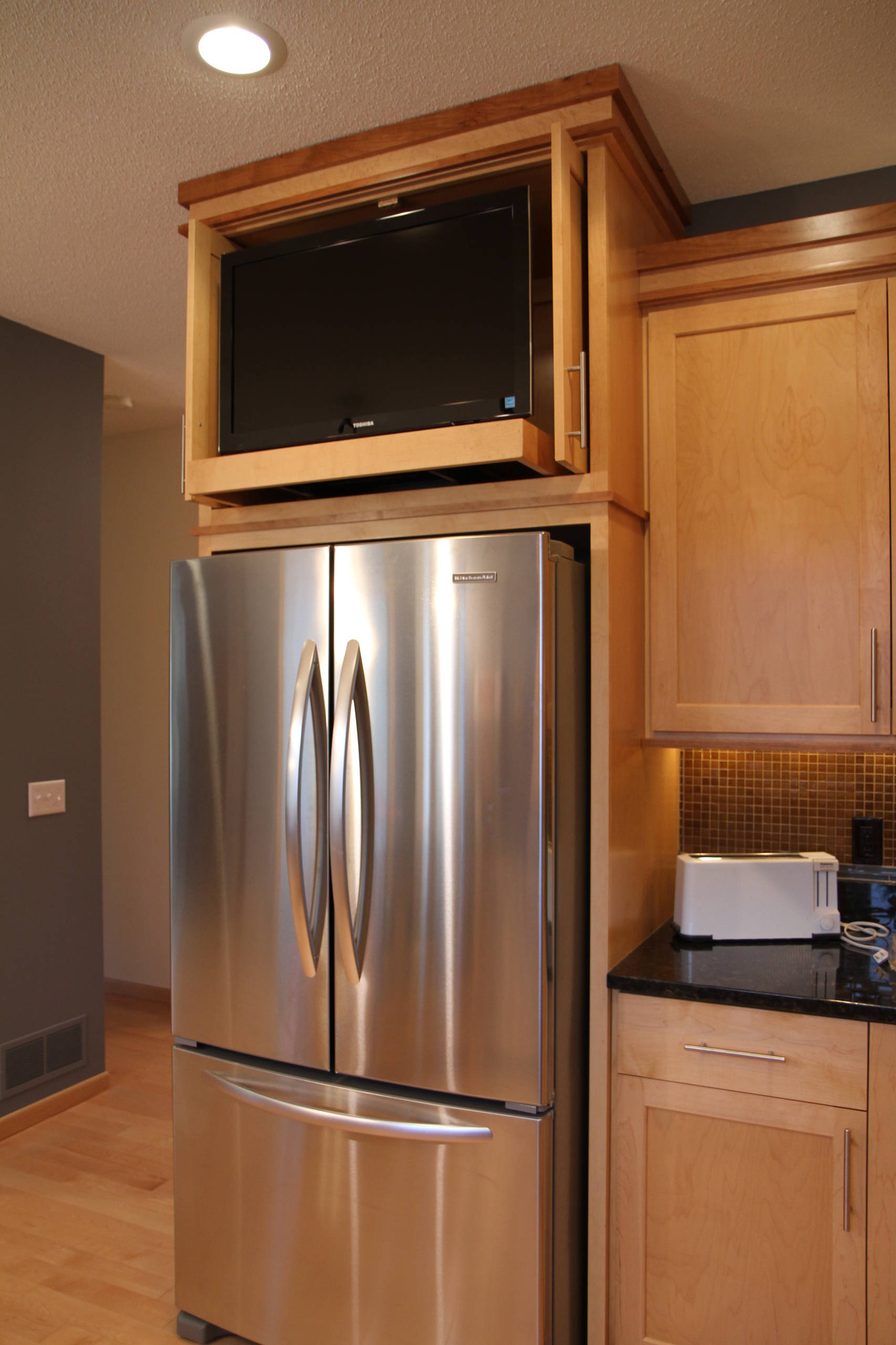 In this case the refrigerator door sticks out beyond the base cabinets. But because there are deep side panels and a deep cabinet overhead, the refrigerator looks incorporated into the cabinetry and built in. A deep cabinet above the refrigerator is a good place for tray storage or even a TV, as shown here.