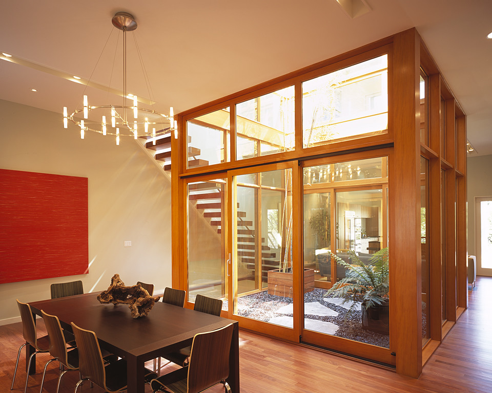 Repetition and symmetry has its own classic appeal, as is seen in the sequential placement of tall trees. They serve the dual purpose of not only acting as a partition but as also complementing the modern frame of the atrium. The look can easily be extended to your living and dining room as well.