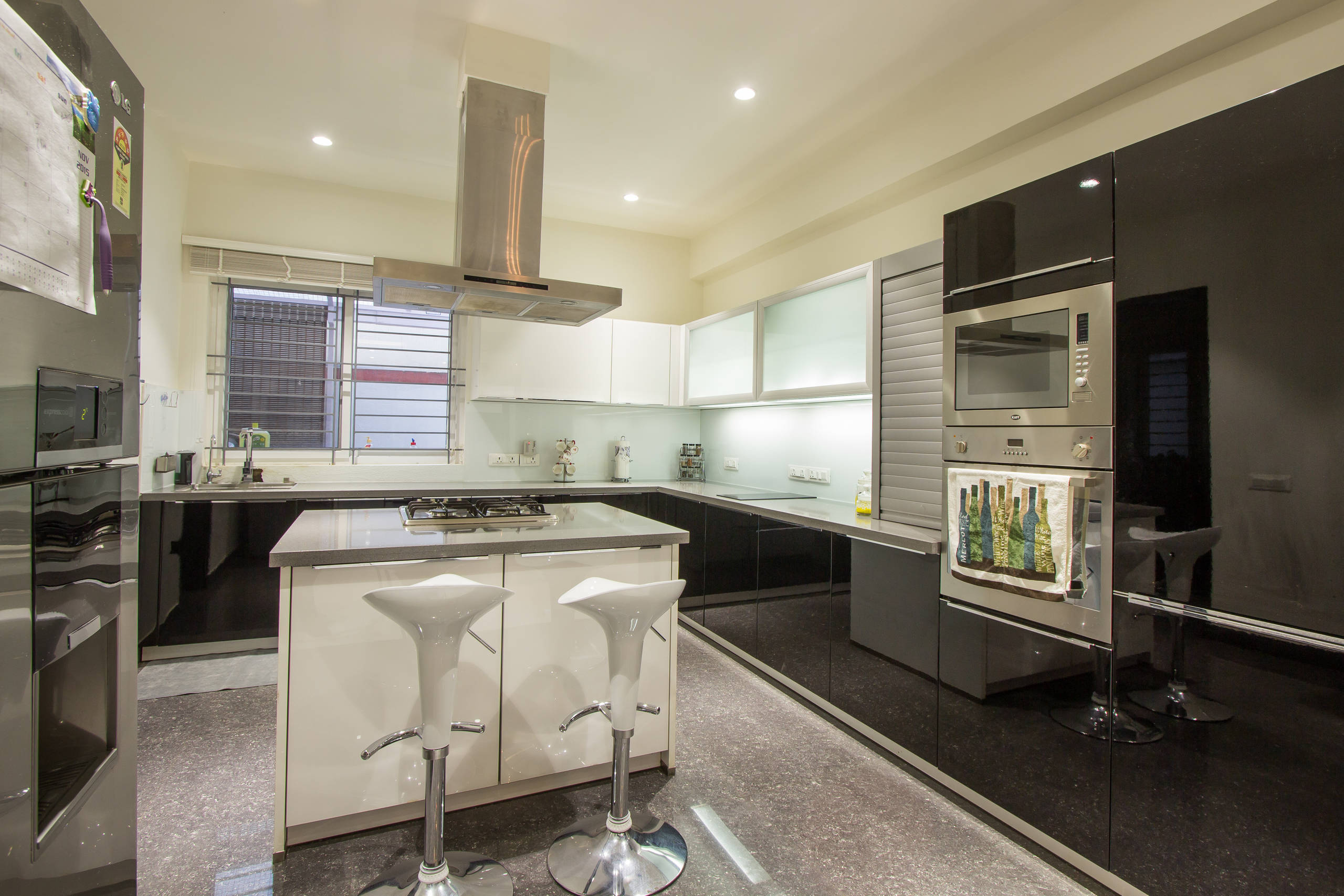 The half-and-half layout can work in many homes. The kitchen area can be open to the dining space yet it can be kept enclosed with a bit of privacy. A half-wall or a counter deftly sections off the cooking part of the kitchen while leaving the rest open. In this kitchen by Design Arc Interiors Bangalore, the prepping counters and gas cooking stove are placed inside while the refrigerator and serving area are outside. A win-win situation!