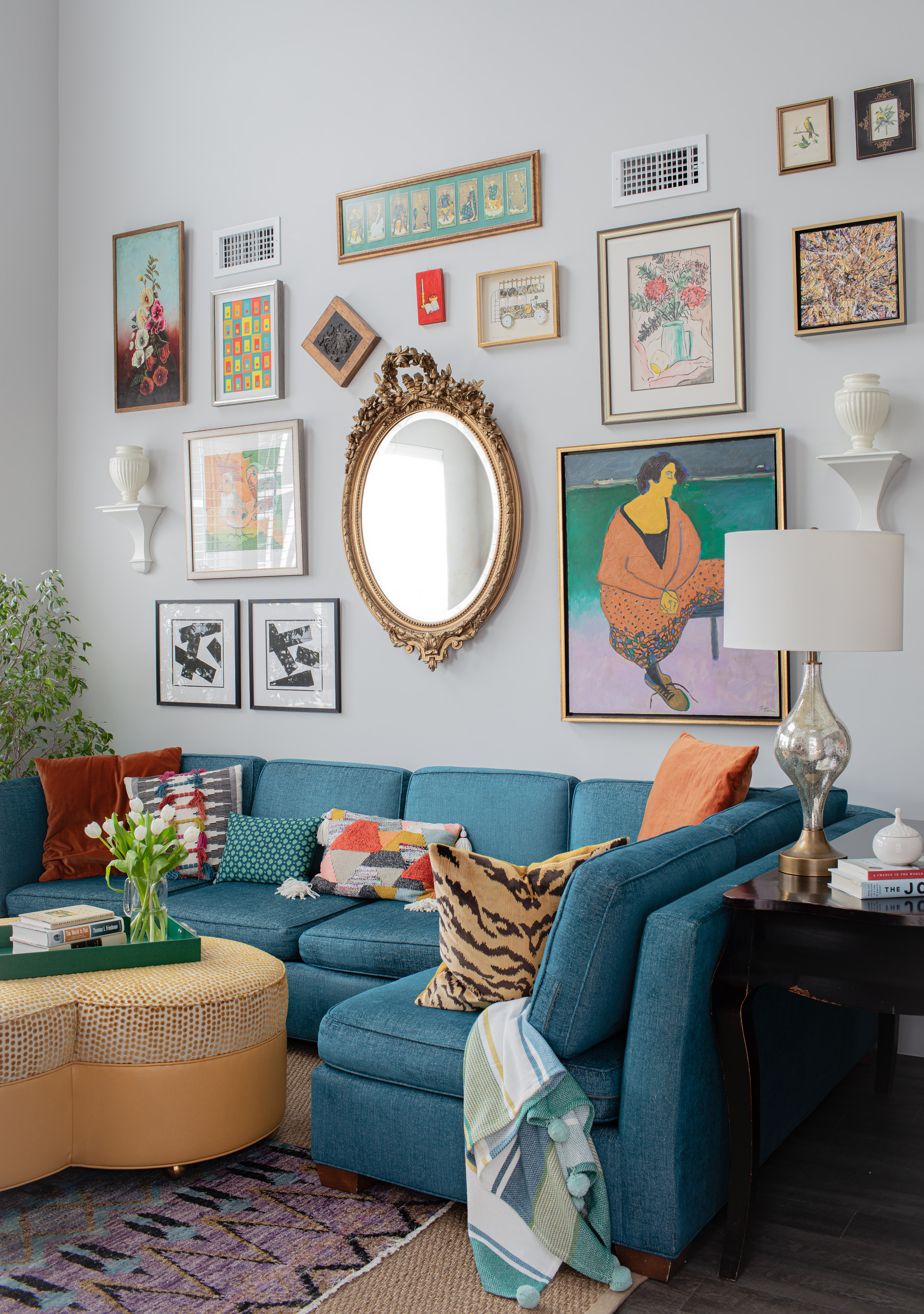 Use the extra wall space your low-profile sofa provides to balance the space with artwork that starts low and goes high. Great examples are hanging a large-scale art piece or arranging a vertical row of shelves that draws the eye up.