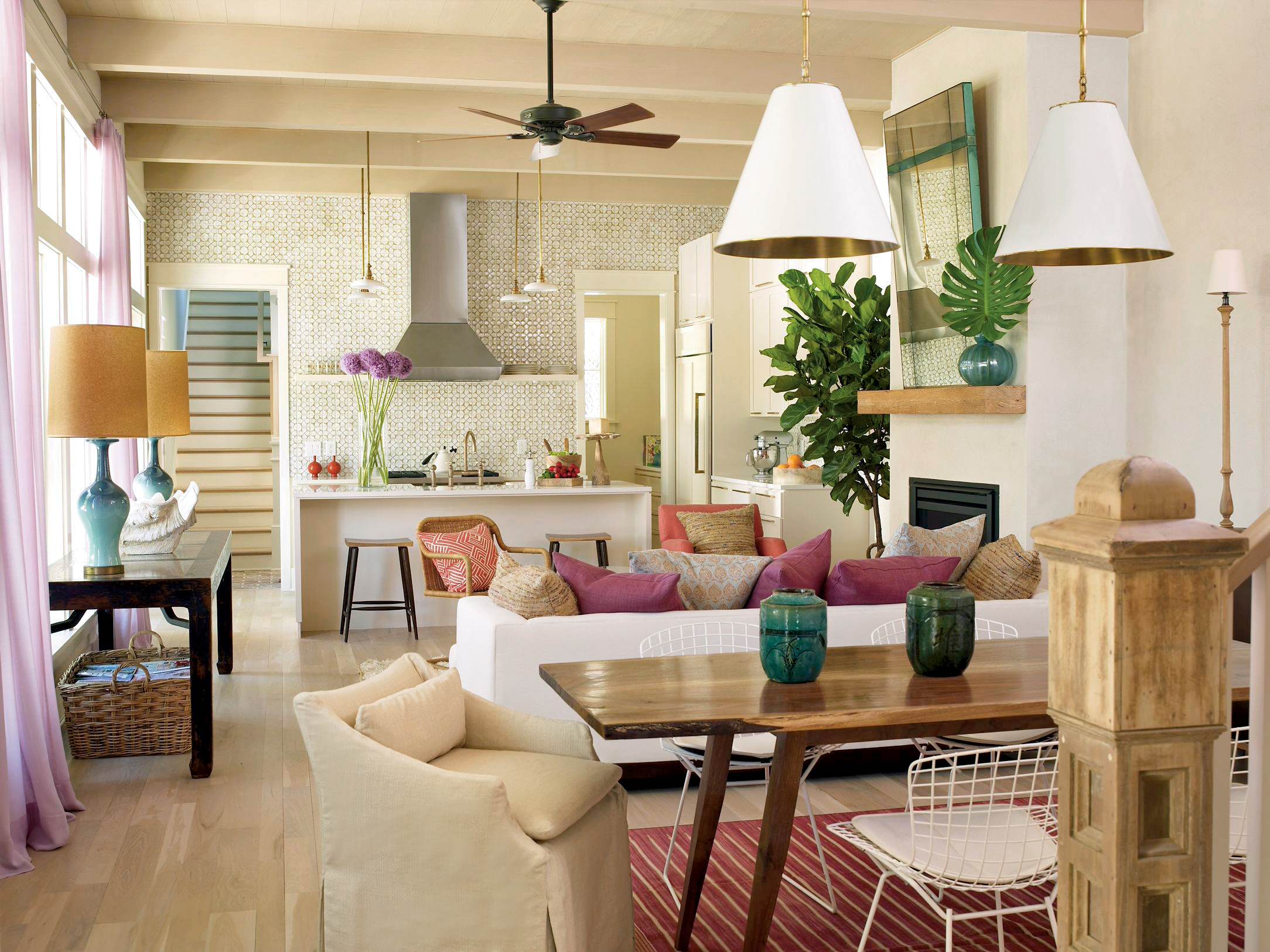 You can further define the layout by placing a different ceiling light in each separate space. For example, in the living area, you could choose a light that sits close to the ceiling, then in the adjacent dining space, you could hang a pendant directly over the table.