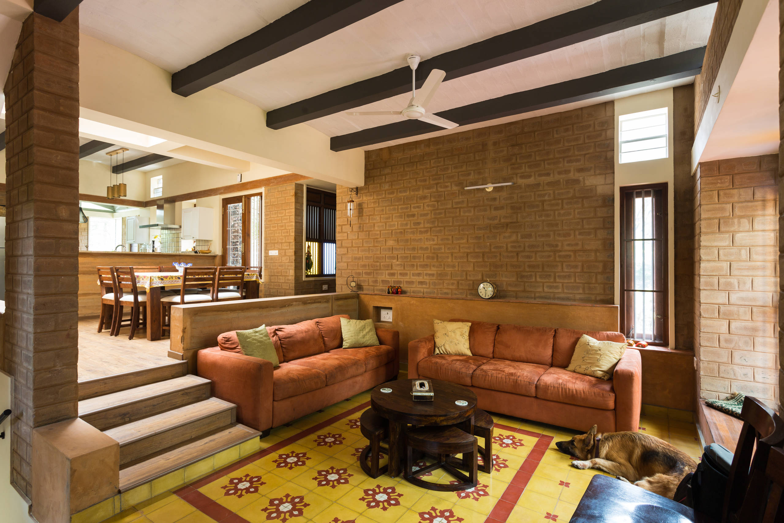 In this image, bright and bold patterned athangudi tiles segregate the living room from the dining area and team up nicely with the decor.