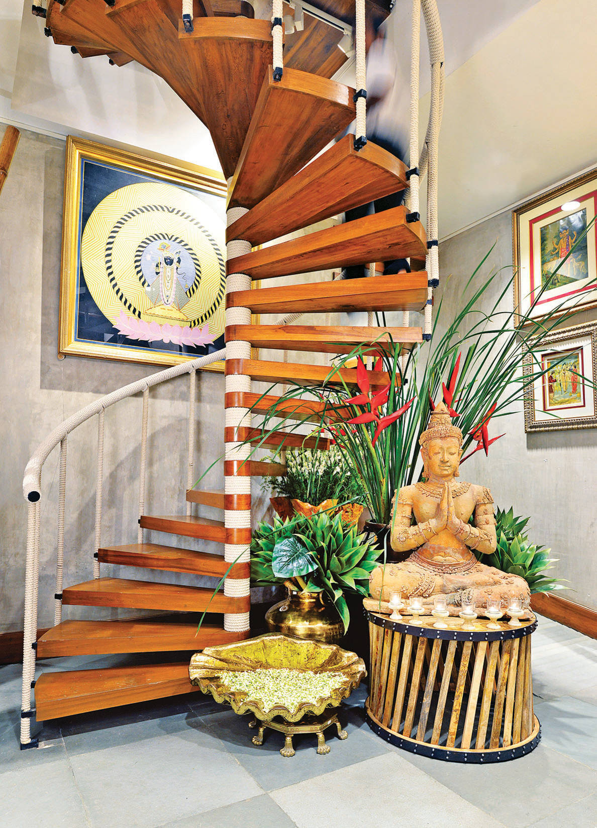 11. Paintings, tapestries and motifs apart, traditional sculptures carry an atmosphere of the exotic with them. See how the Buddha sculpture kept atop a cane stool and surrounded by plants and other accessories brings a magnetic, rich look to the landing area.