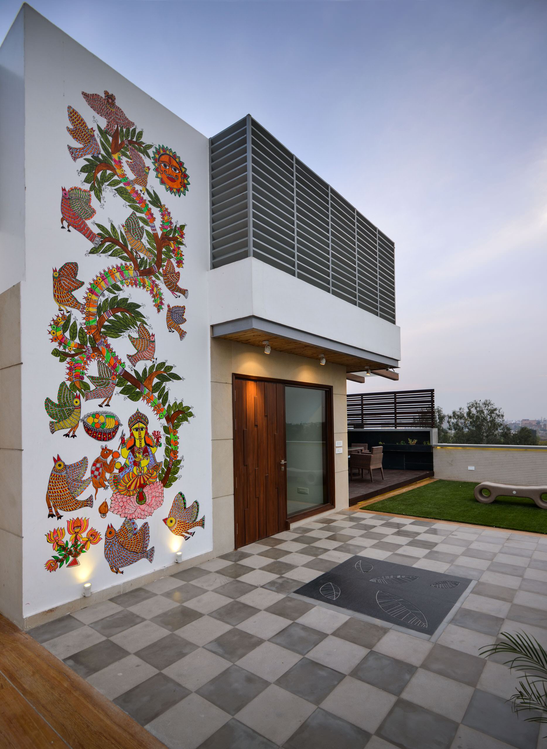 9. On the terrace of the same house (left), a Madhubani artist has painted a colourful full-length mural on the wall. The floor, cast in black kadappa stone in a checkered pattern, is decorated with a leaf design in stone at the centre.
