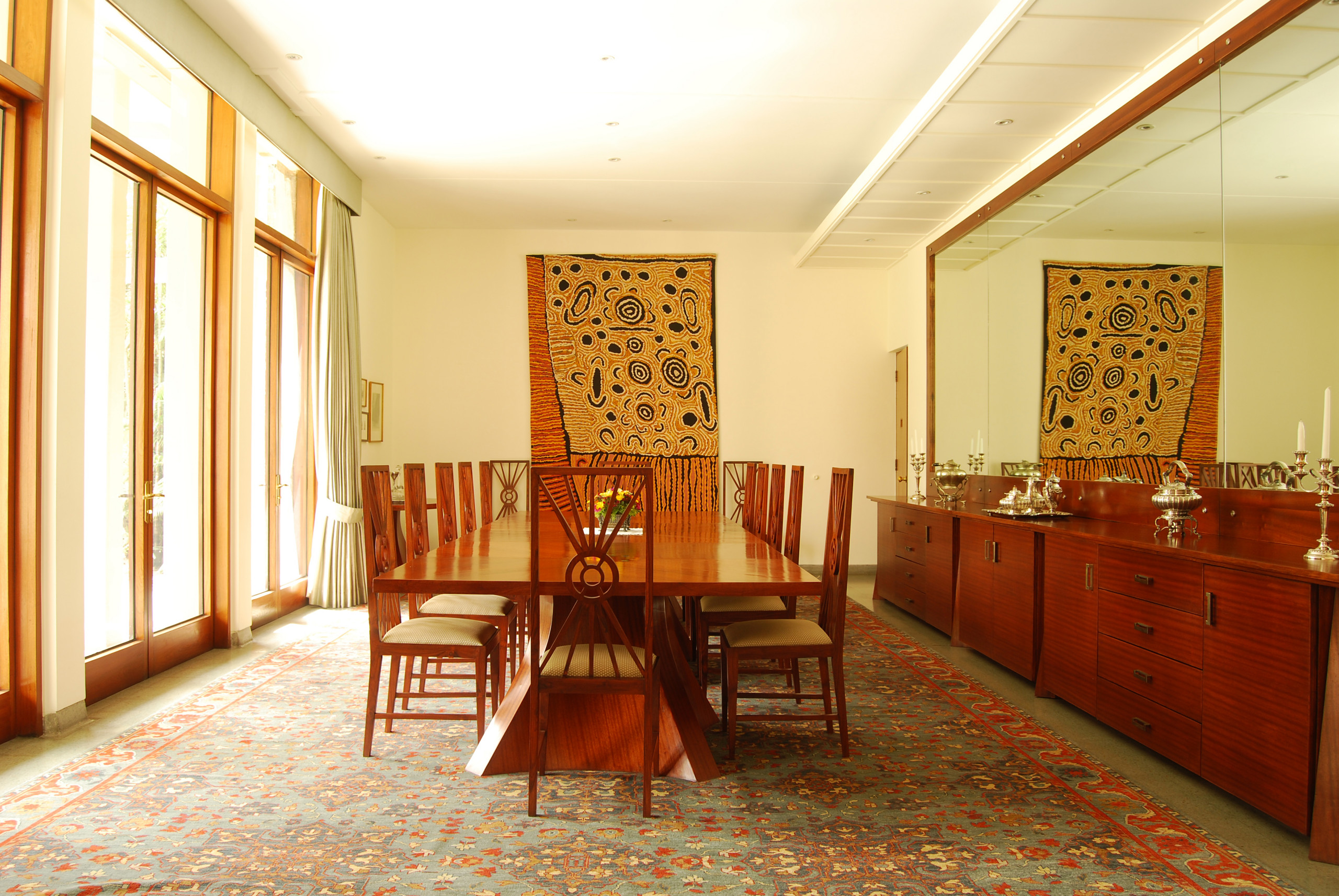7. A Kashmiri carpet or dhurrie, a classic example of Indian crafts, can be framed or pinned up on a wall, as is done with a modern version of the dhurrie in this dining room by The Hidden Gallery – a quick and easy way to seamlessly introduce a traditional element into a modish room.