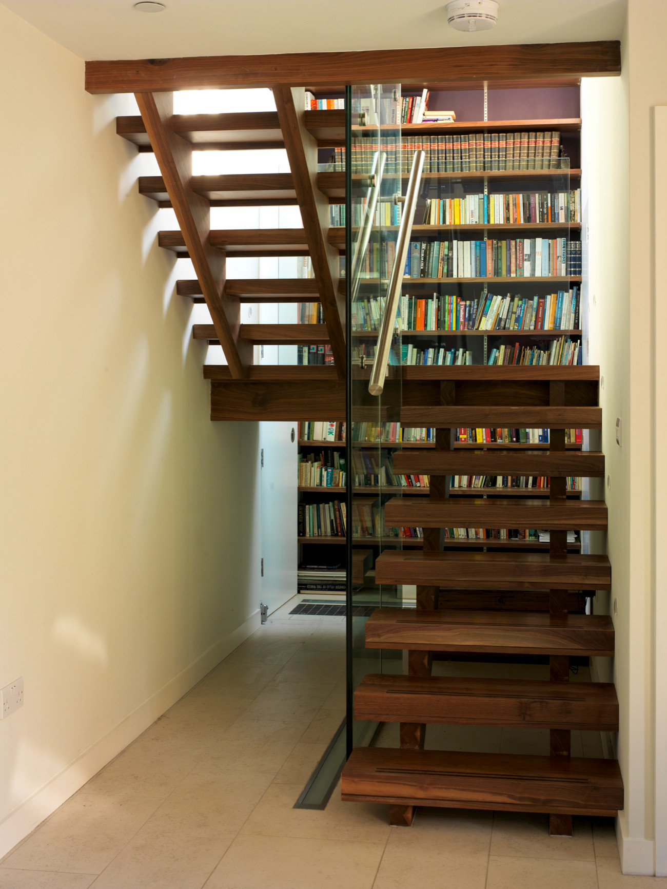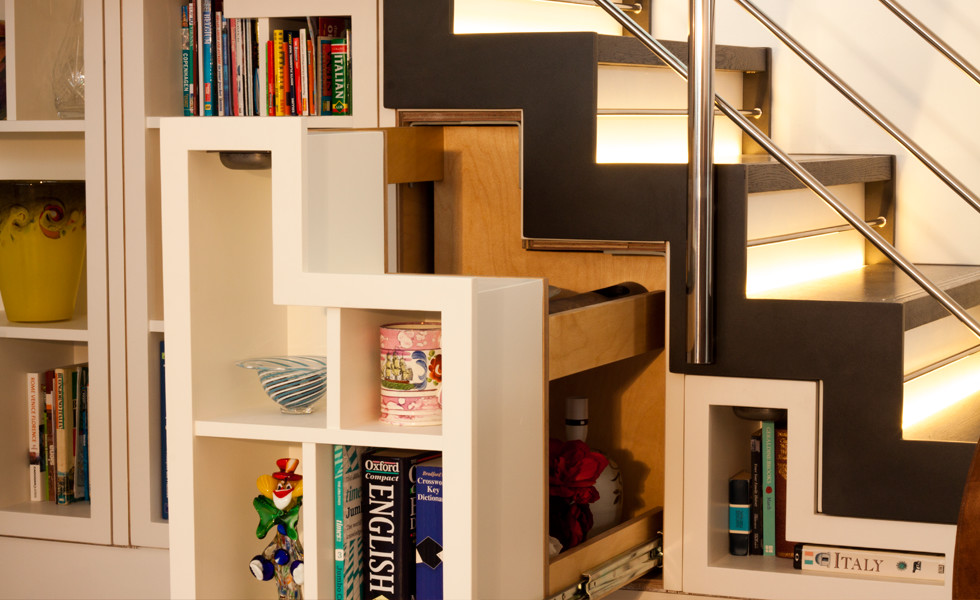 When using the space under a straight staircase, keep in mind that the depth of the area available to you is equal to the width of the steps. This can prove to be quite deep for a simple bookcase. Seen in this picture is a great under-stair storage solution by Matthew McCrossan where the shelves for your home library form the ‘doors’ of a hidden pull-out storage system.