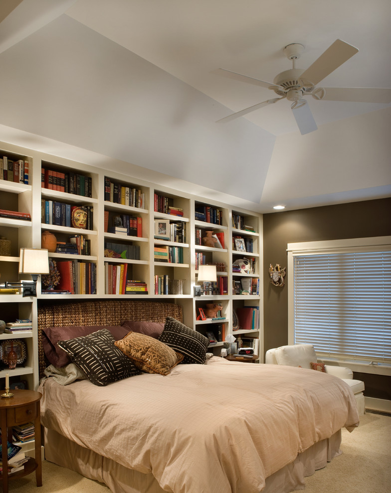 A great way to insert a library into your bedroom is to frame the headboard with shelves as seen in this bedroom designed by Melaragno Design Company. Alternatively, you can go in for an entire wall piece where the headboard is part of the shelving unit.