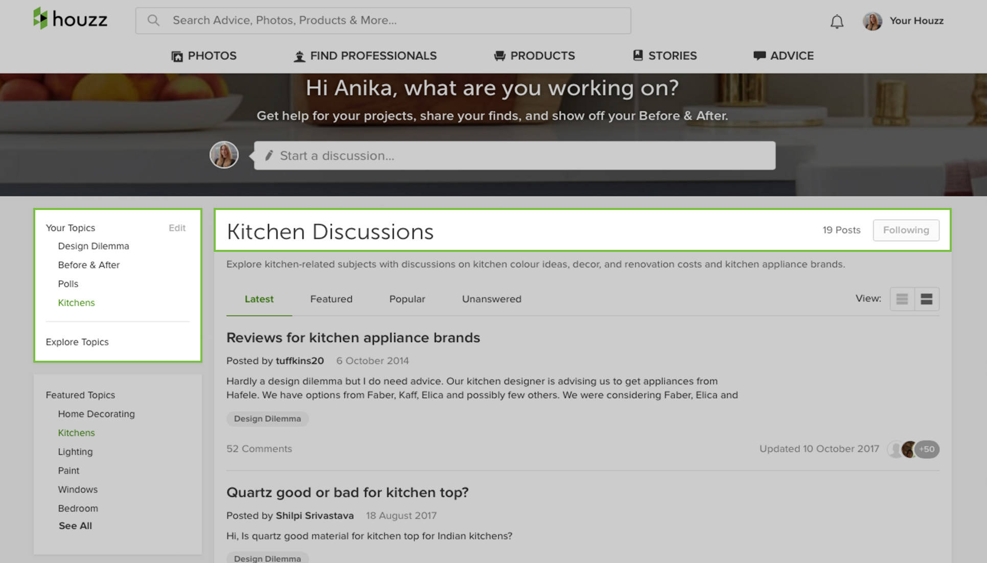 For example, you might be working on a kitchen renovation and seeking kitchen-related advice. Now, with just a click of the Follow button, you can refine your experience and tune into topics like “Kitchens” and “Remodelling,” specifically.