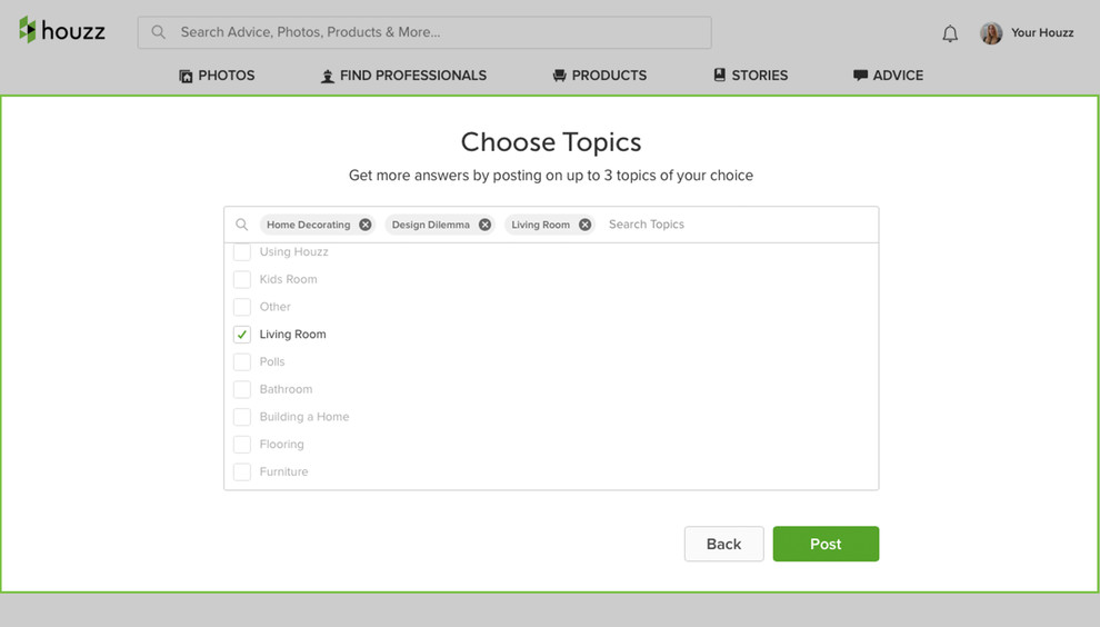 You can now also post your questions under multiple relevant topics at the same time to get a wider range of feedback. If you are looking for clever ideas for a small living room, for example, it is possible to select multiple topics like “Living Room”, “Smaller Homes” and “Home Decorating.”