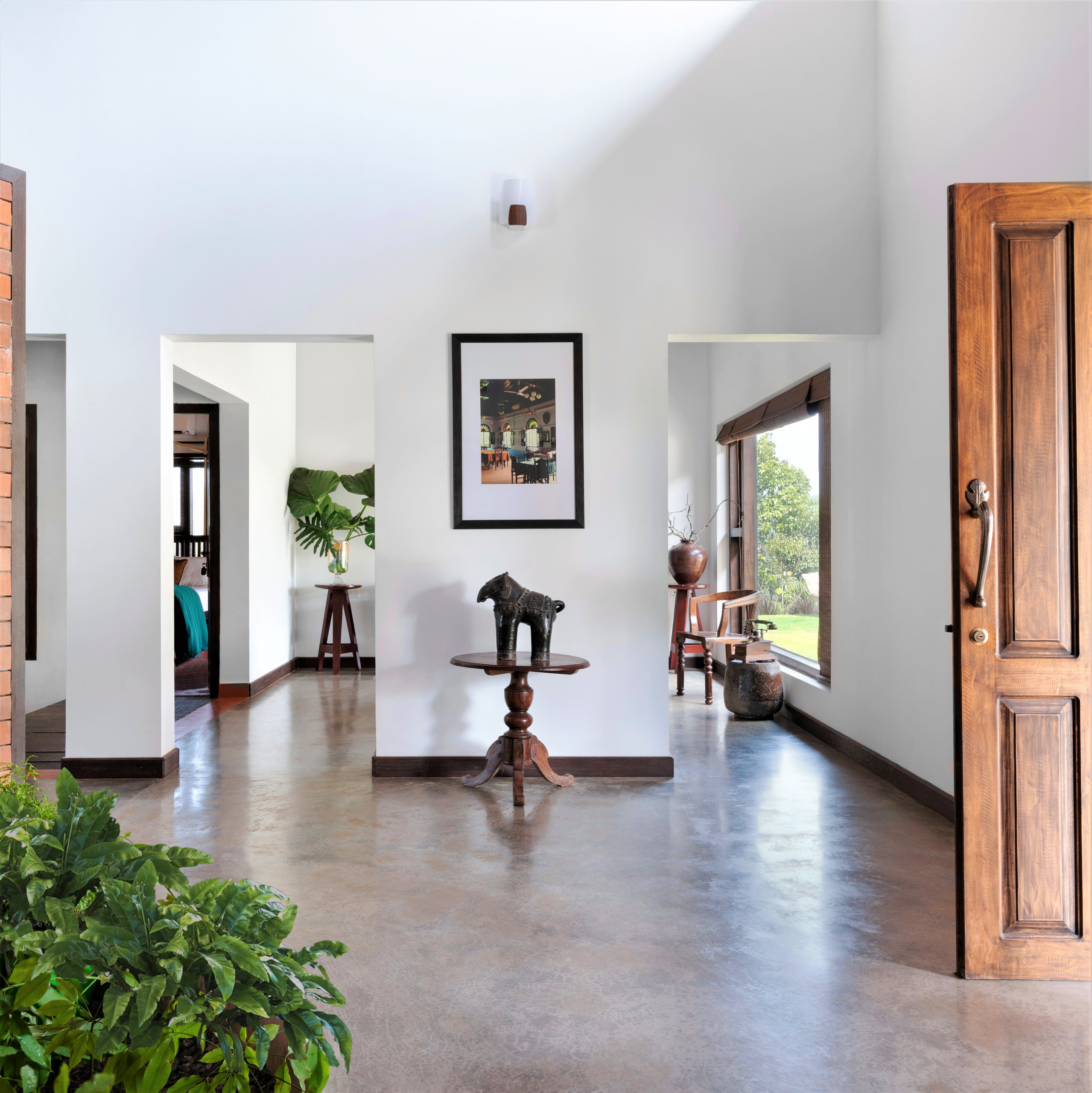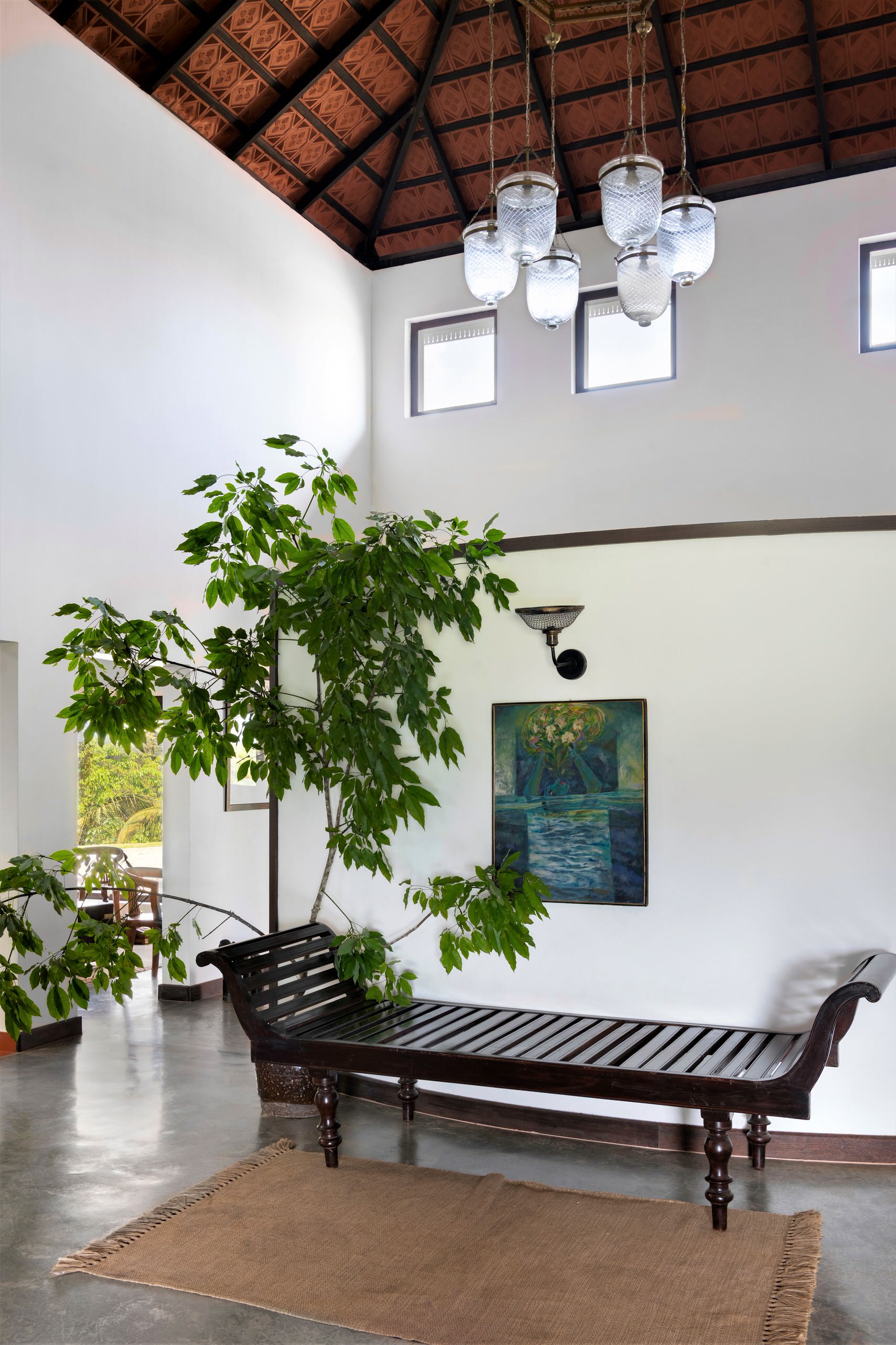 As one enters the home, the double-height foyer ushers in a feel of grandeur and expanse. Antique and heritage accents such as the teak doors add charm and character to the area. The doors and artefacts were purchased by the homeowner from an old manor house near Mattancheri, the art hub of Kerala.