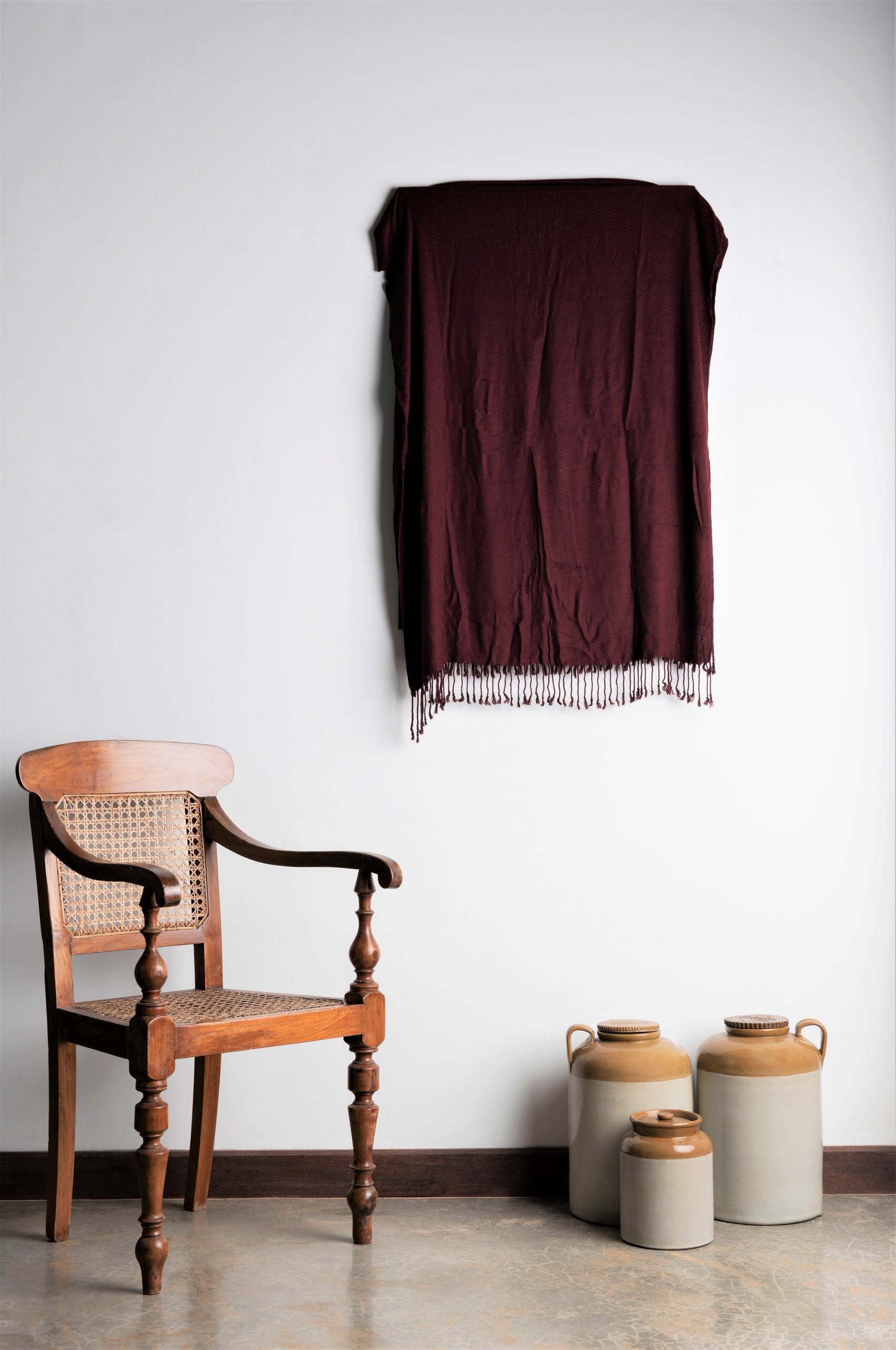 “In the dining room, the dining table and the hanging clay pendants were designed in-house. These are paired with a bench and three-legged chairs, which we sourced from Mattancheri,” says Afnan.