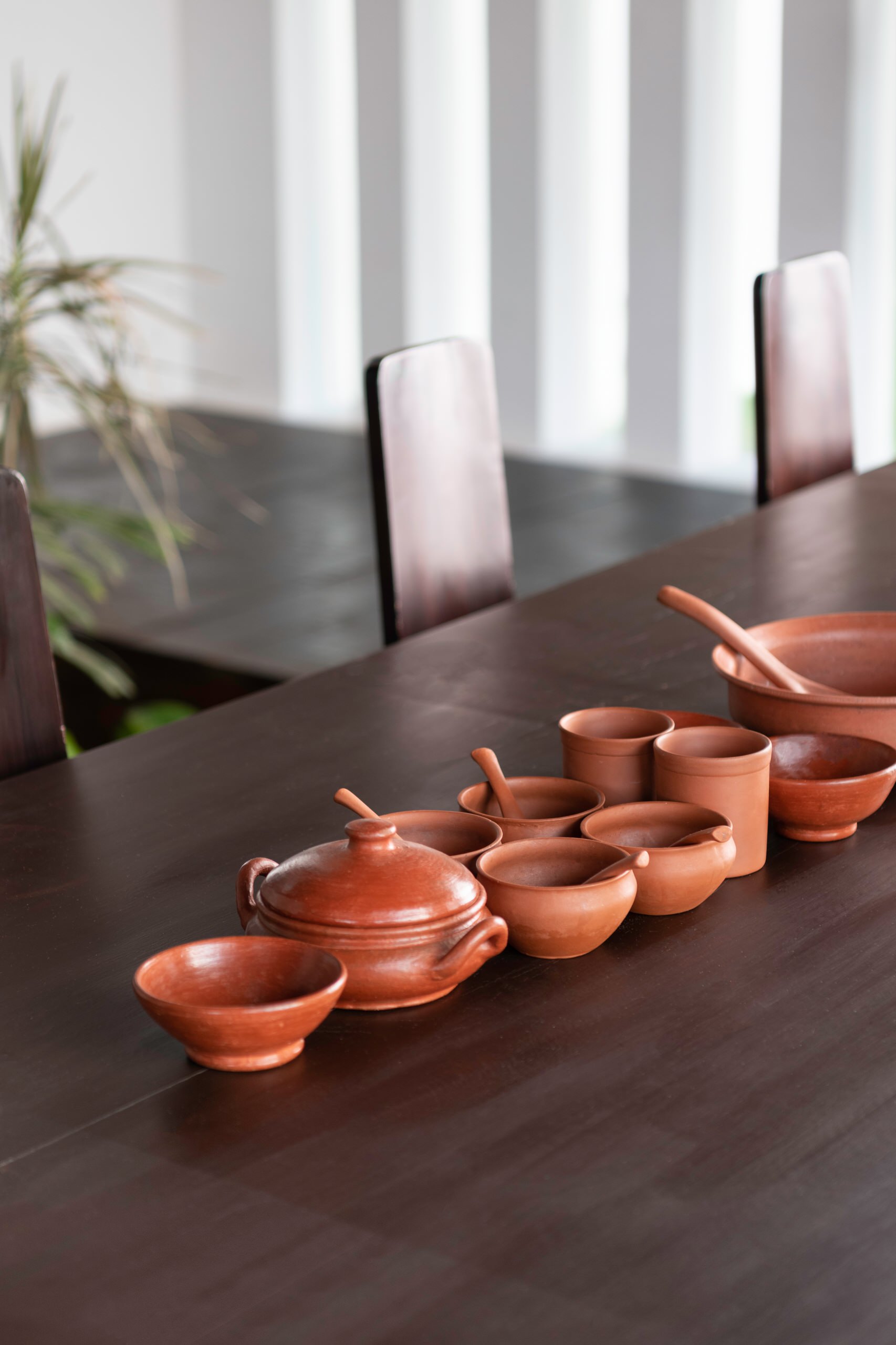 Contemporary earthenware displayed on the dining table complements the hanging pendant lamps.