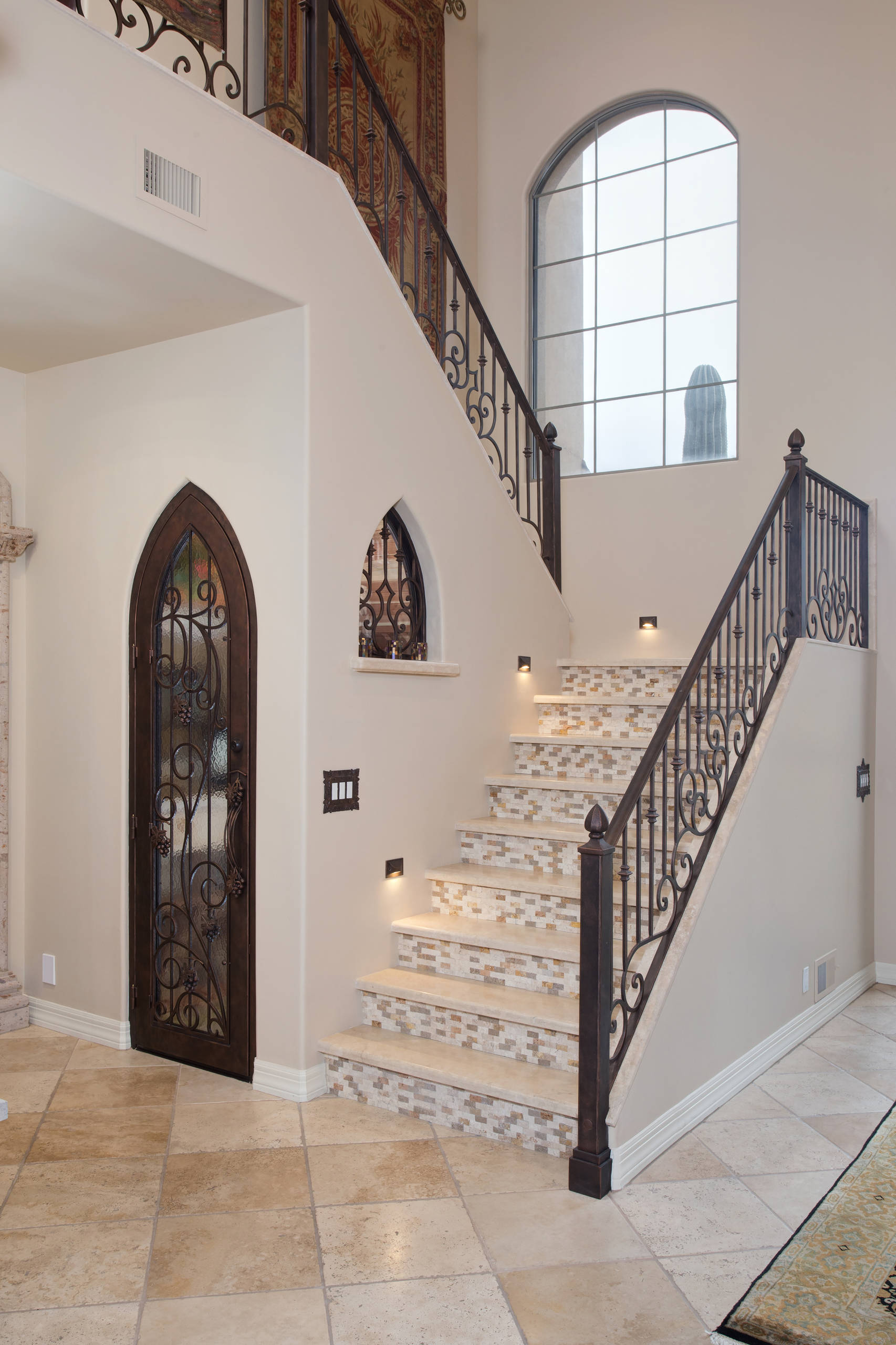 The total height of the rise of a staircase depends on the height of the ceiling and depth of the upper-floor structure. With a taller ceiling, such as the one pictured, more risers and treads are needed to make the staircase function.