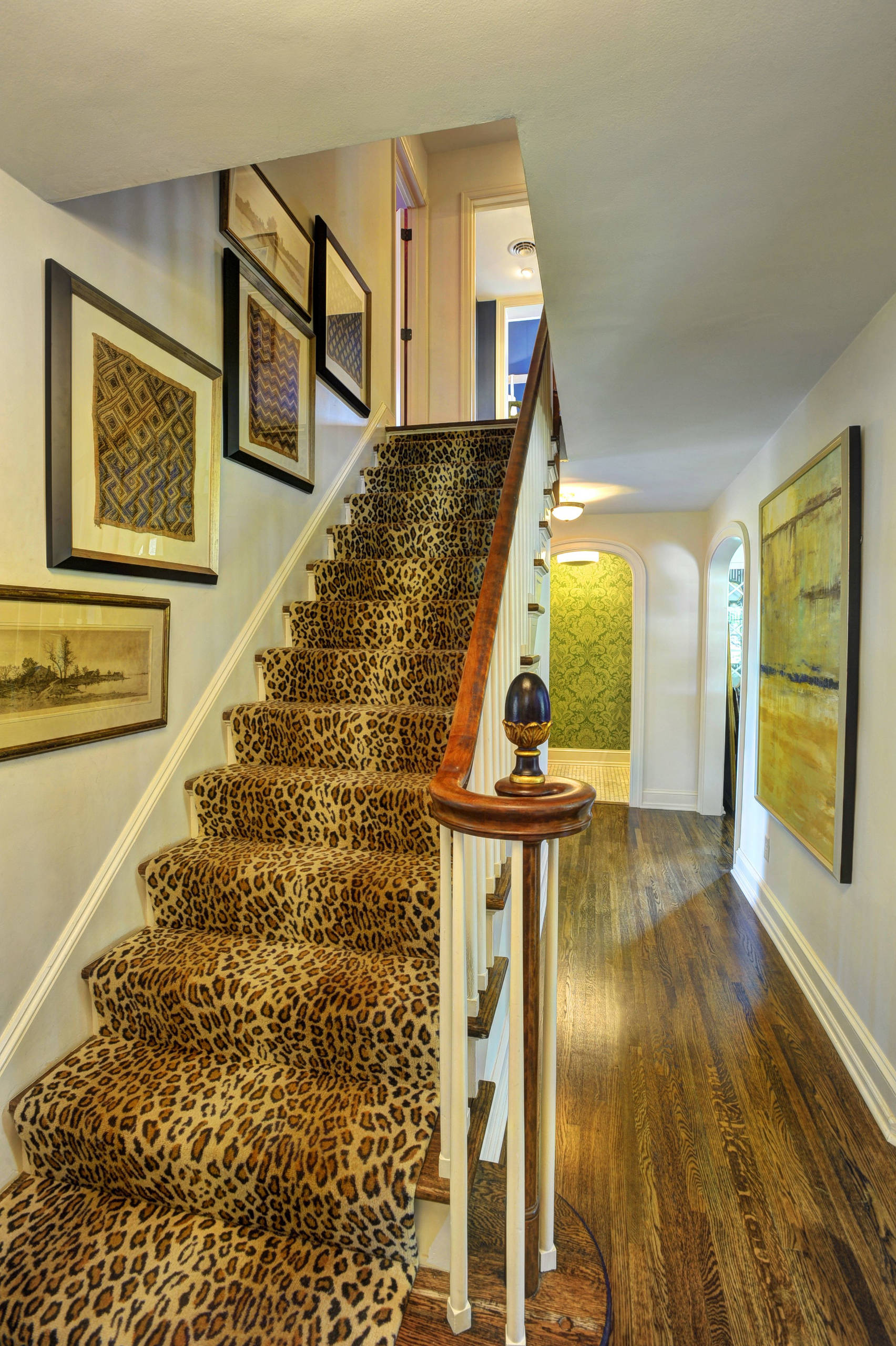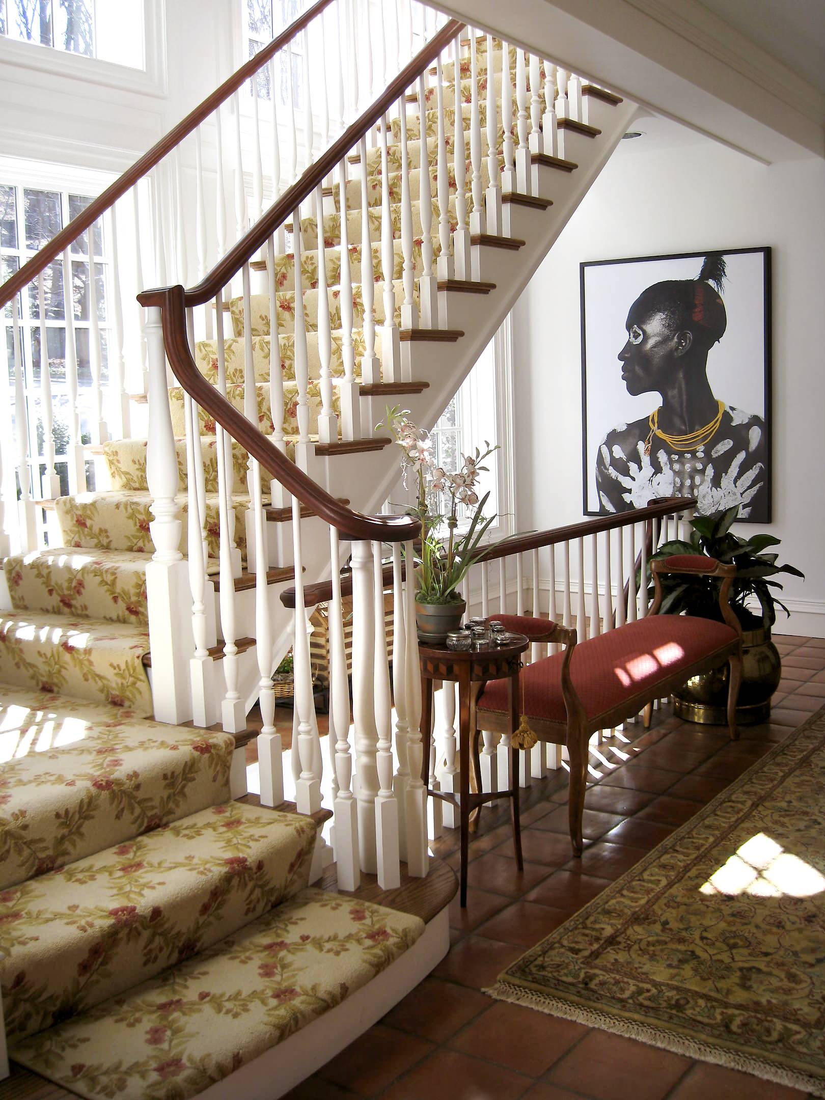 The staircase pictured here has a traditional railing with an open balustrade and detailed treads.