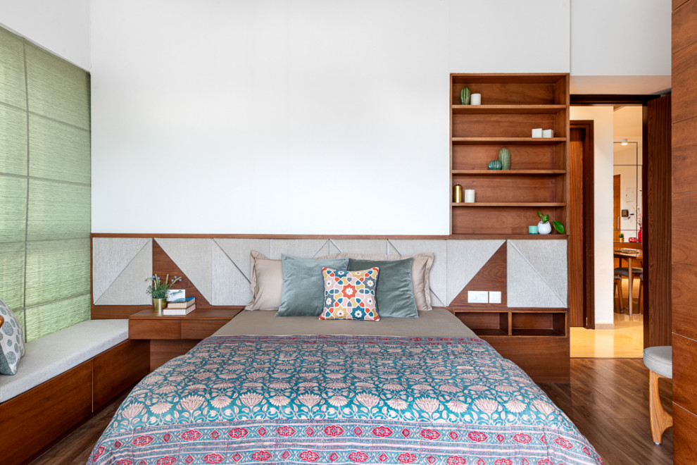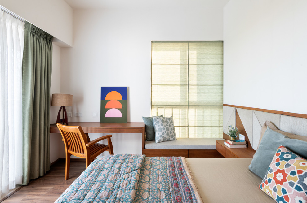 While the rest of the home is awash in lighter hues of teak, the master bedroom features darker tones to complement the existing wooden flooring, which the homeowner wanted to retain. Asymmetrical patterns of the tufted headboard introduce texture and add depth to the decor.