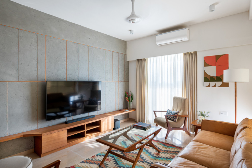 The furniture in the living room is inspired by the aesthetics and works of celebrated twentieth-century furniture designers such as Johannes Anderson, Arthur Umanoff and Vladimir Kagan. Standing against the backdrop of a raw concrete wall, the entertainment unit ties the look together. The metallic grooves on the wall balance the dark thin lines of the foyer screens. The cinnabar hues of the three-seater leather sofa by WestElm and custom-made teak furniture by local craftspersons complement the earthiness of the wall.