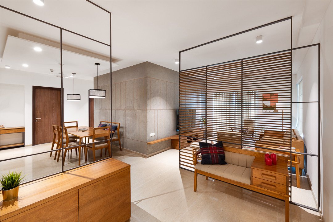 Locally sourced teak and tactile elements describe the material palette of this tenth-floor home. The front door opens into a foyer where a louvred wood-and-metal screen offers privacy and shields the living area from direct view. A teak-wood settee offers seating and storage.