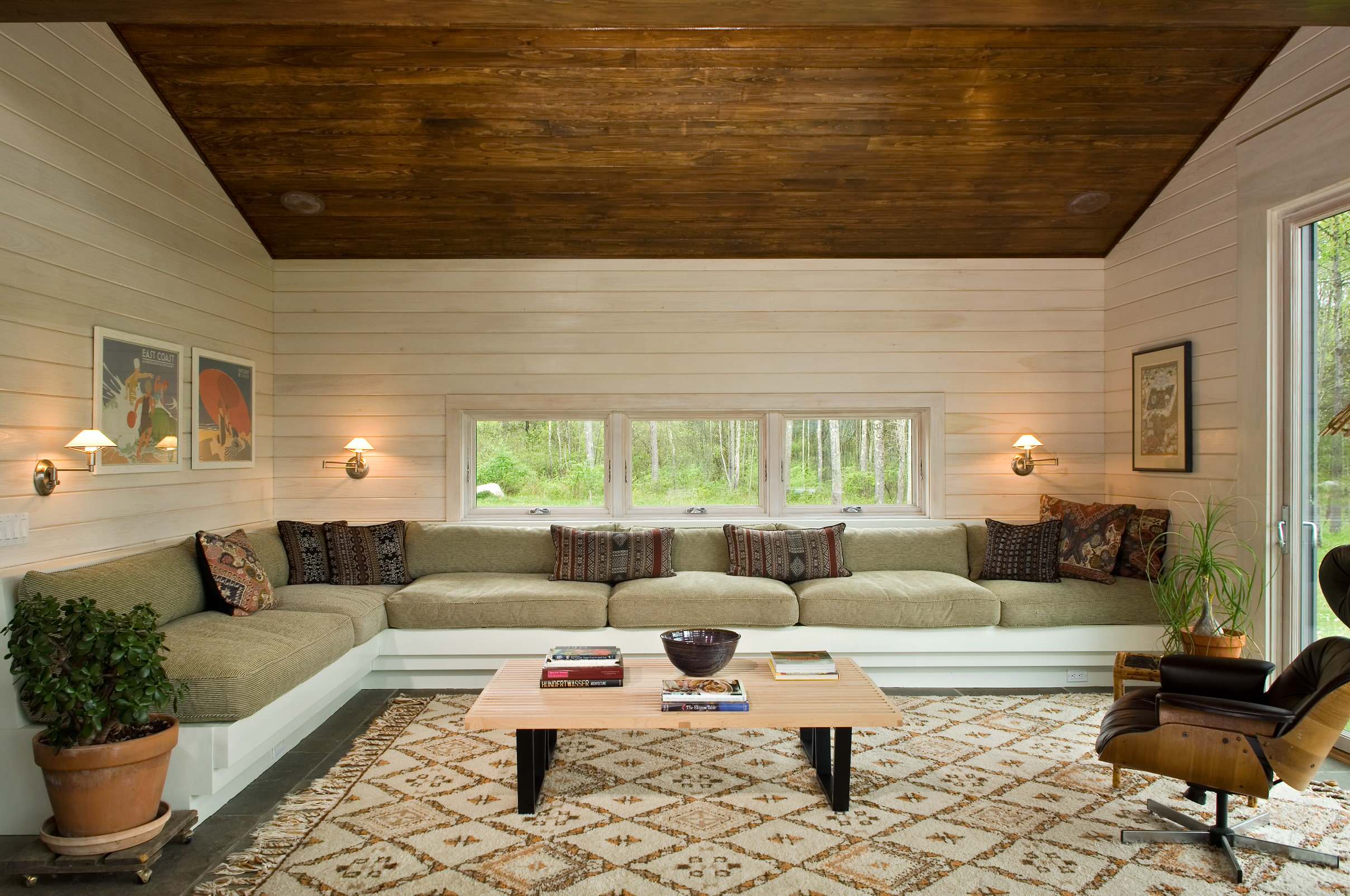 The woodworkers at Troy Cabinetmakers created a large built-in sectional for this rustic living room in Boston. Because of the room’s dark wood ceiling and light wood walls, the base of the built-in is white painted wood to keep the space from feeling too dark. The sofa cushions are covered in a sage-green corduroy.