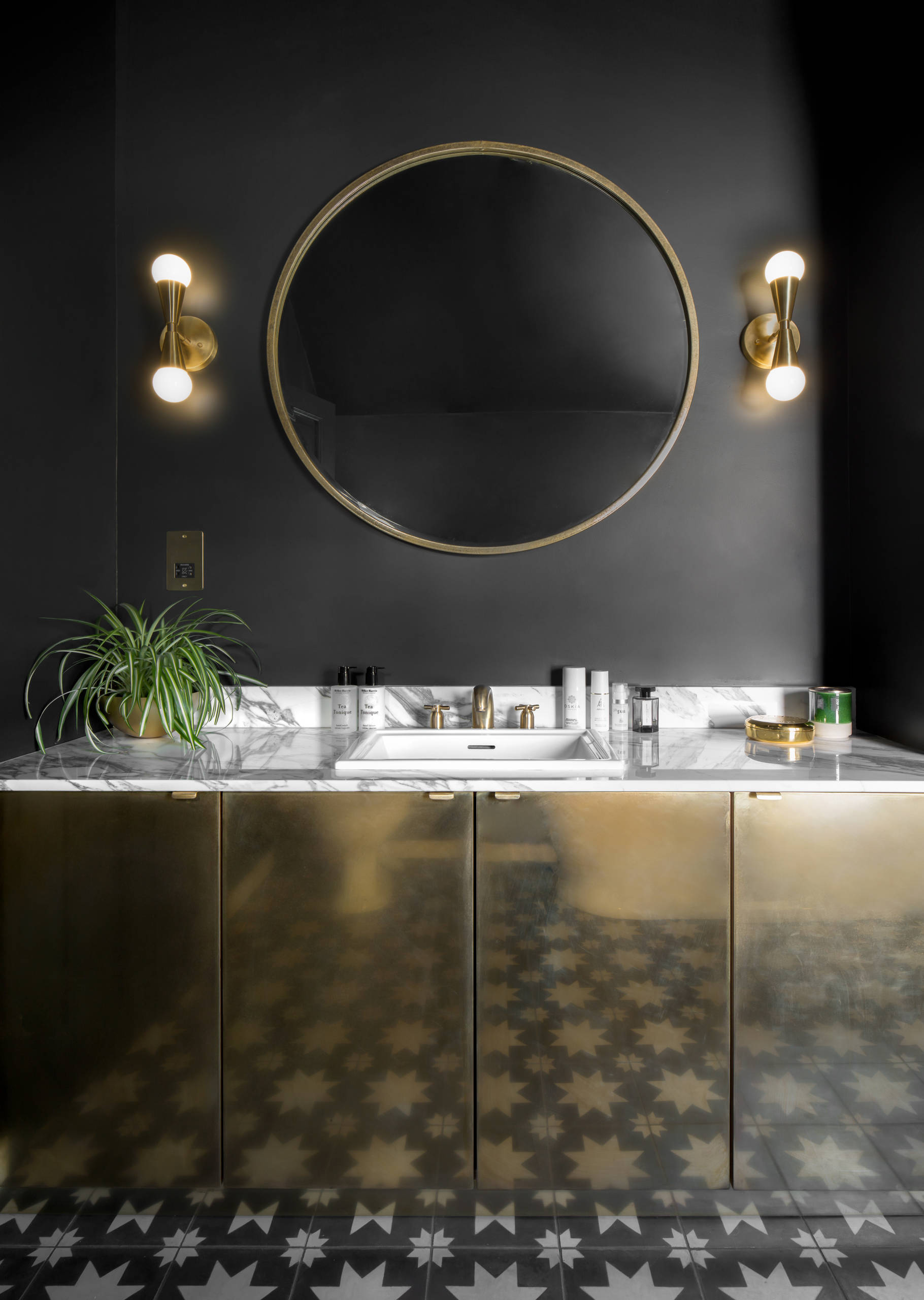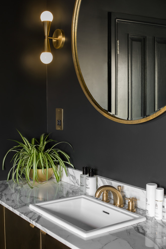 The wall colour was also influenced by the choice of materials in the room. “I knew I wanted statement marble and brass hardware, and that I didn’t want anything else to be fighting for attention,” she explains. “Black brought out the beauty of those natural textures and kept it looking elegant rather than shouty.”