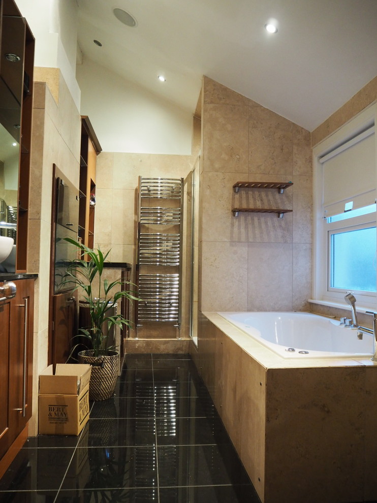 Jessica kept most of the layout the same, but decided to replace the wall that divided the shower from the bath with a glass panel.