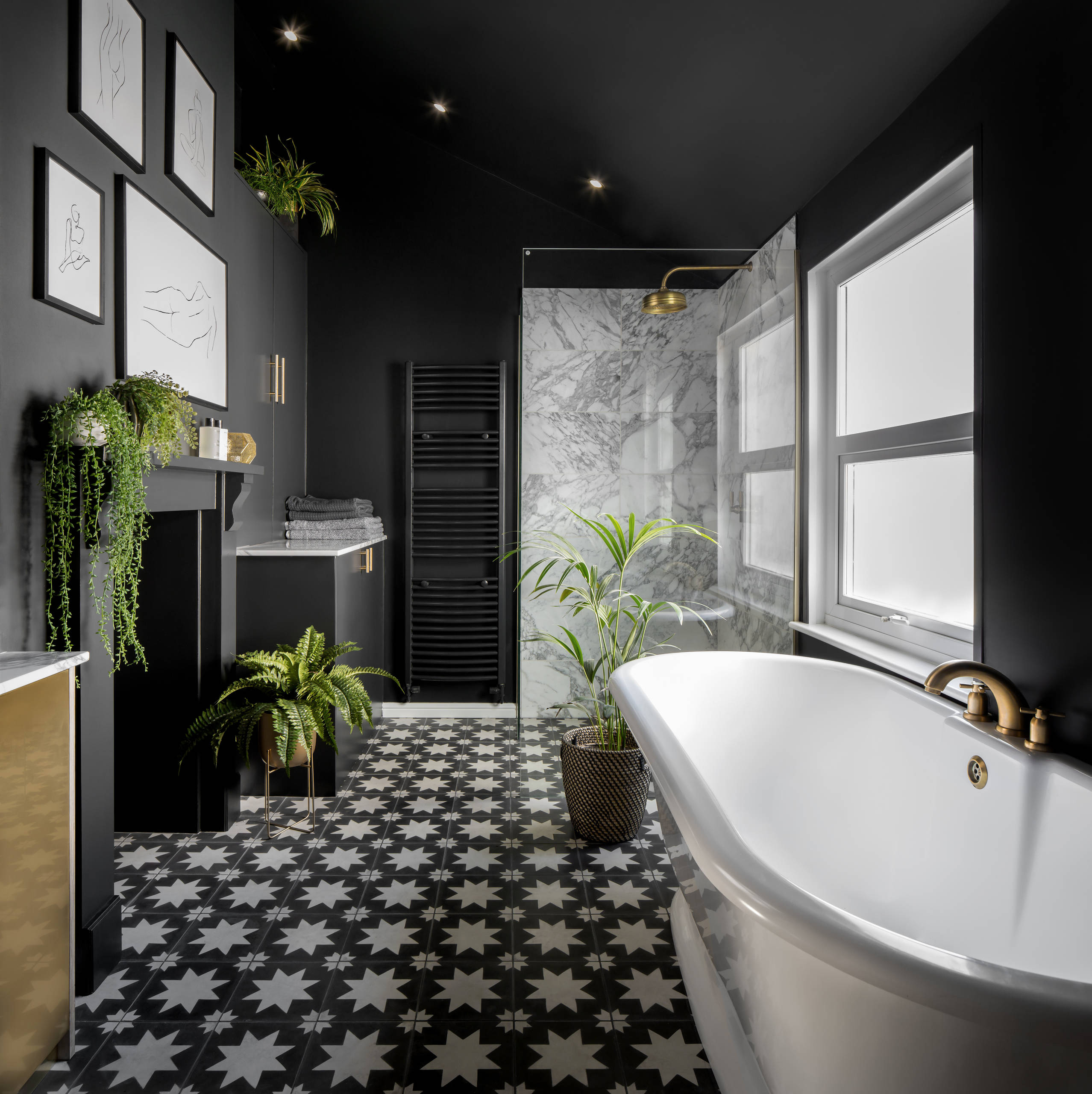 When interiors blogger Jessica Hurrell began designing her bathroom, she had a clear vision of what she wanted – marble and brass surfaces against a black backdrop.
