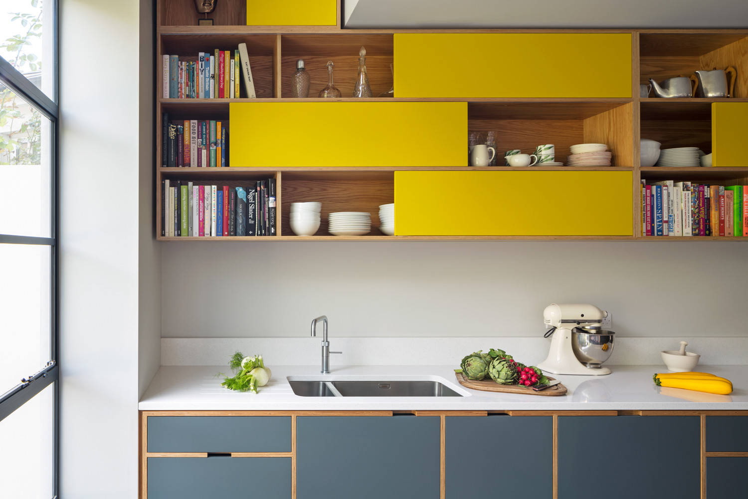 If you’re not sure whether to go for open shelving (which can make a room look bigger but can get dusty or be hard to keep neat) or closed cupboards, take a look at this in-between option. There’s space for the pretty or homely stuff – cookery books, decanters, nice bowls – to be left on show, while leaving plenty of room to hide a little kitchen chaos. We also love the canary yellow teamed with the grey.