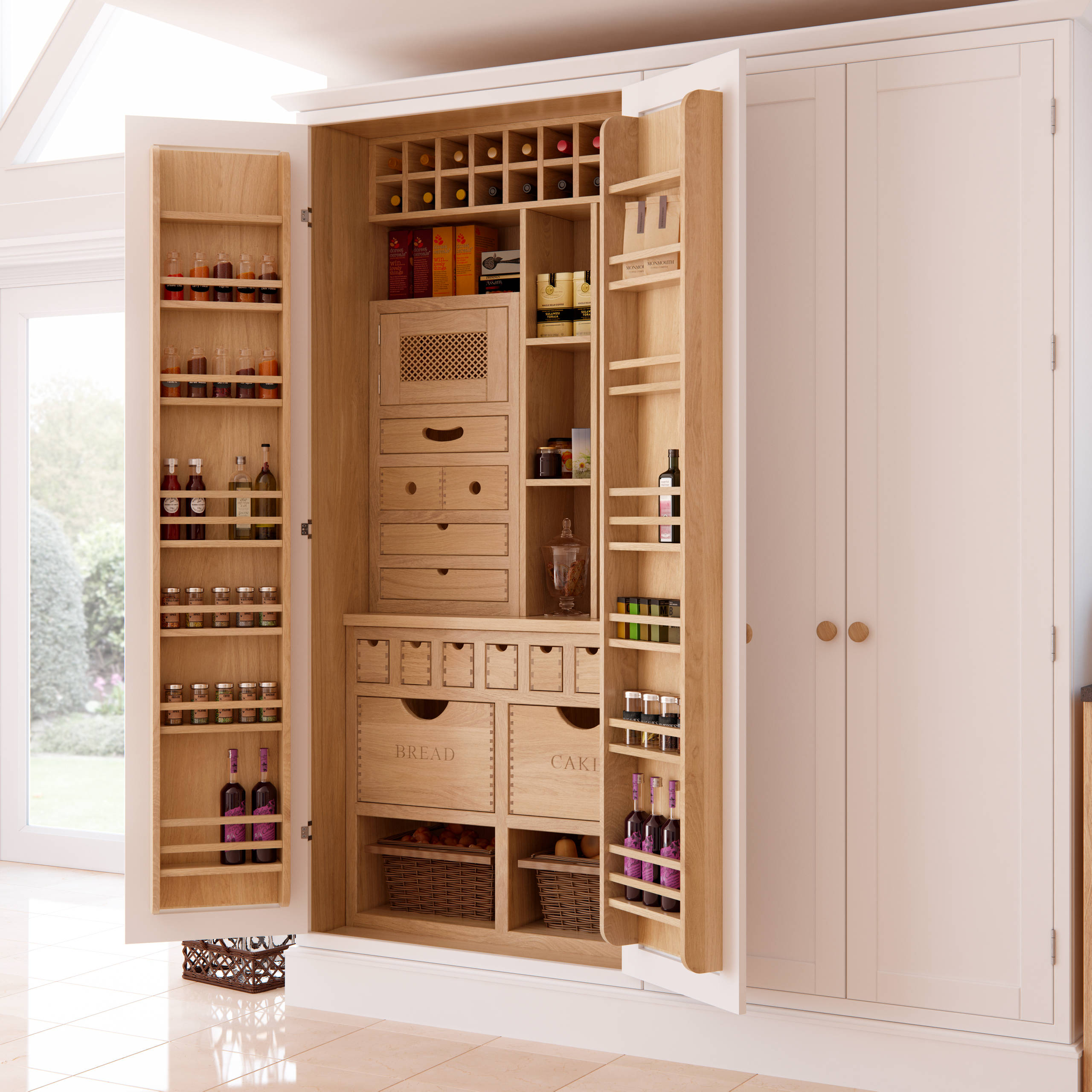 With six baskets in each cupboard, this design makes the most of the available space, and is ideal for packets and jars.