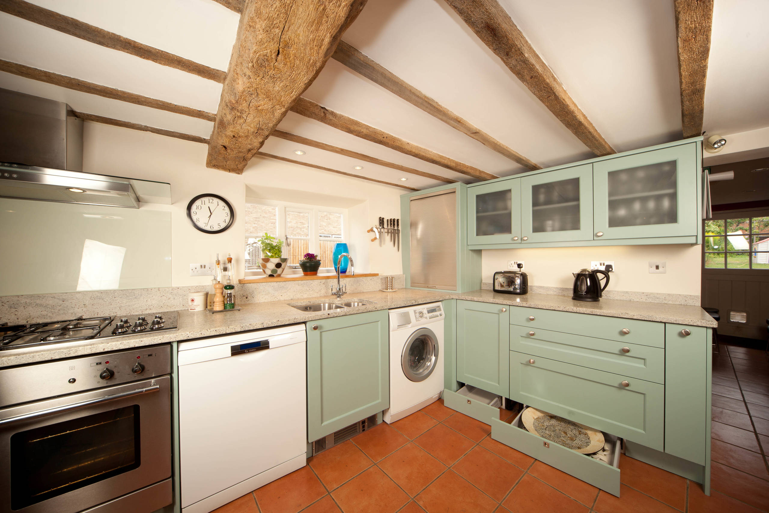 Use every inch of your kitchen, like these homeowners, by putting crafty drawers in at the bottom of units, where you might normally just have a wasted gap behind a kickboard. These plinth drawers will provide a handy home for baking trays and other flattish items you don’t need to access every day. If you’re handy with a screwdriver, buy DIY plinth drawer packs or look for Ikea hacks online to help you create them yourself.