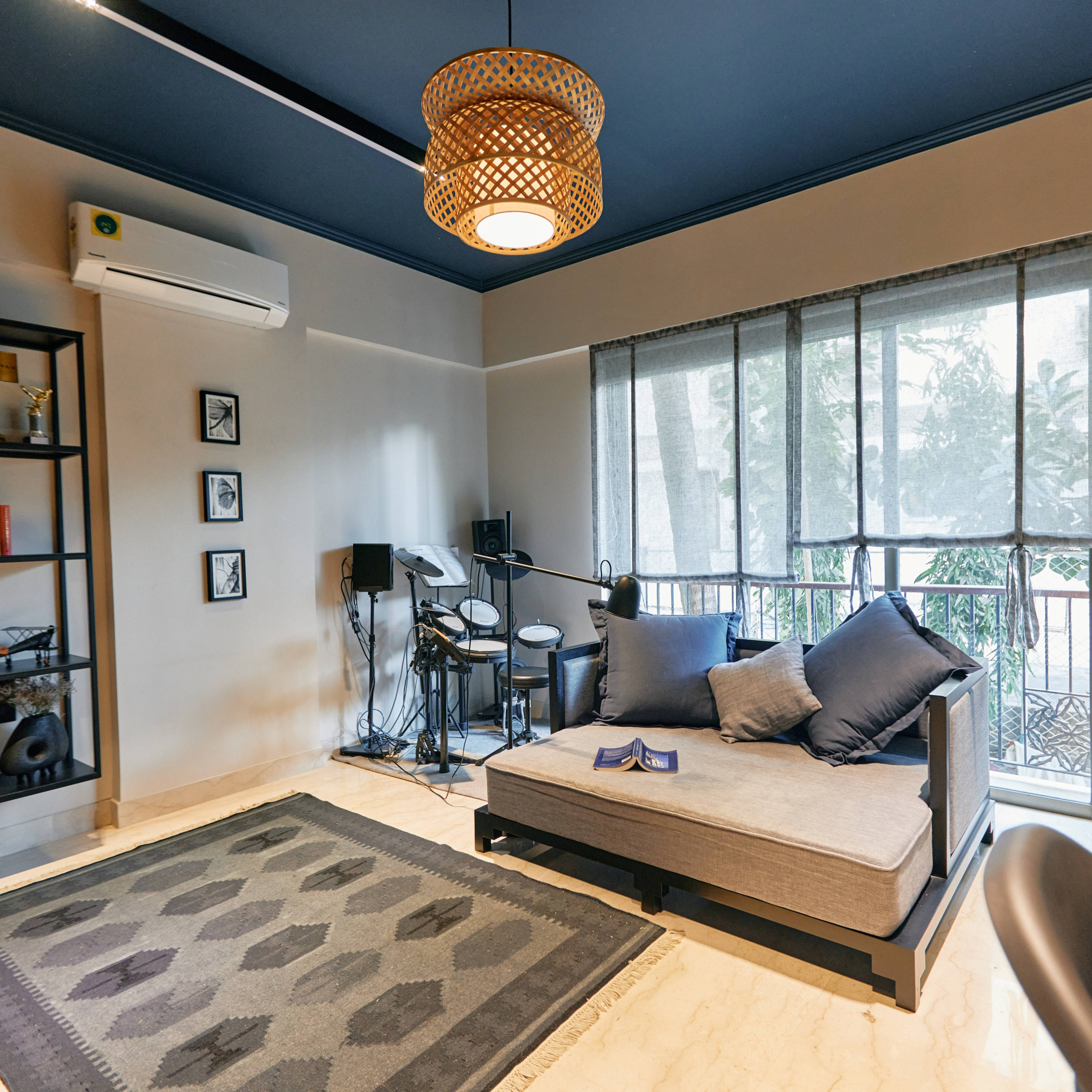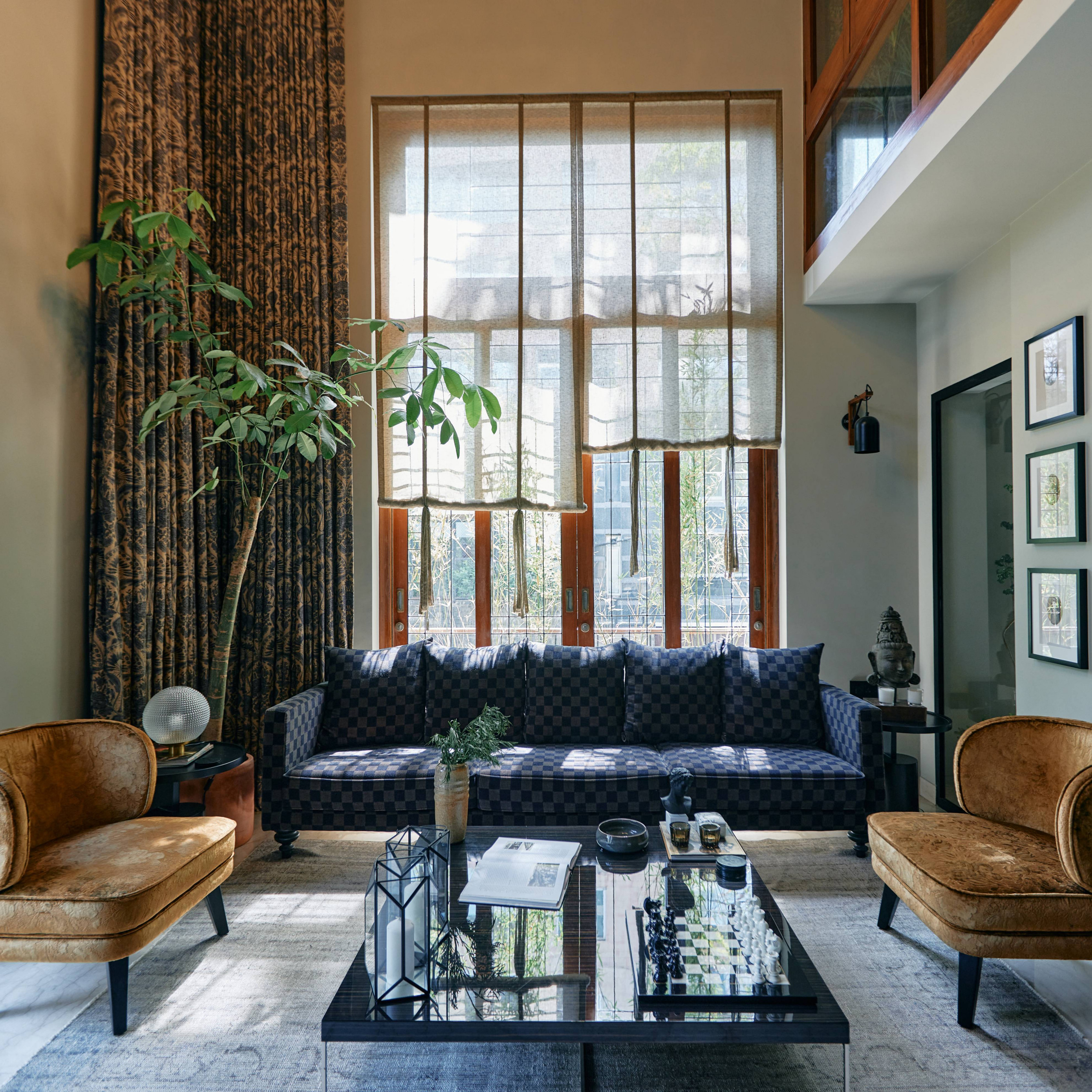 “Double-height ceilings are a rarity in Mumbai and the large windows help further emphasise the room’s height. We chose diaphanous sheers to allow an evolving play of light through the day. The opaque, printed curtains, on the other hand, offer a dramatic dialogue of light and shadow,” says Kaur.