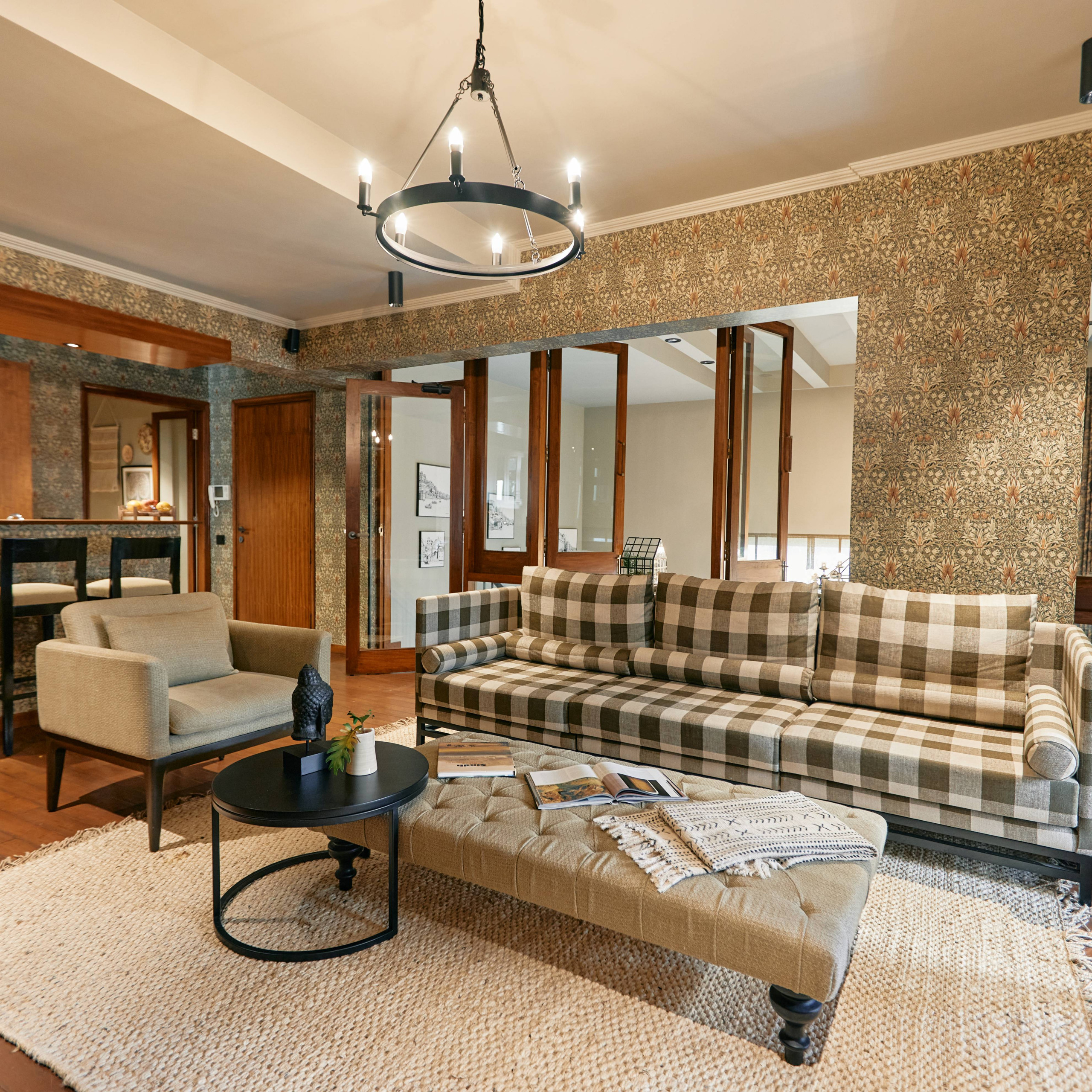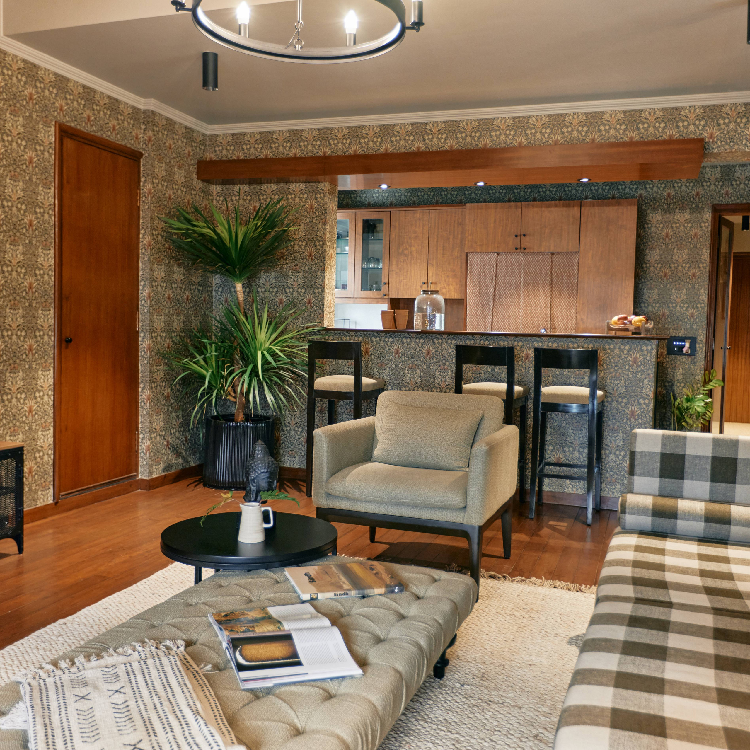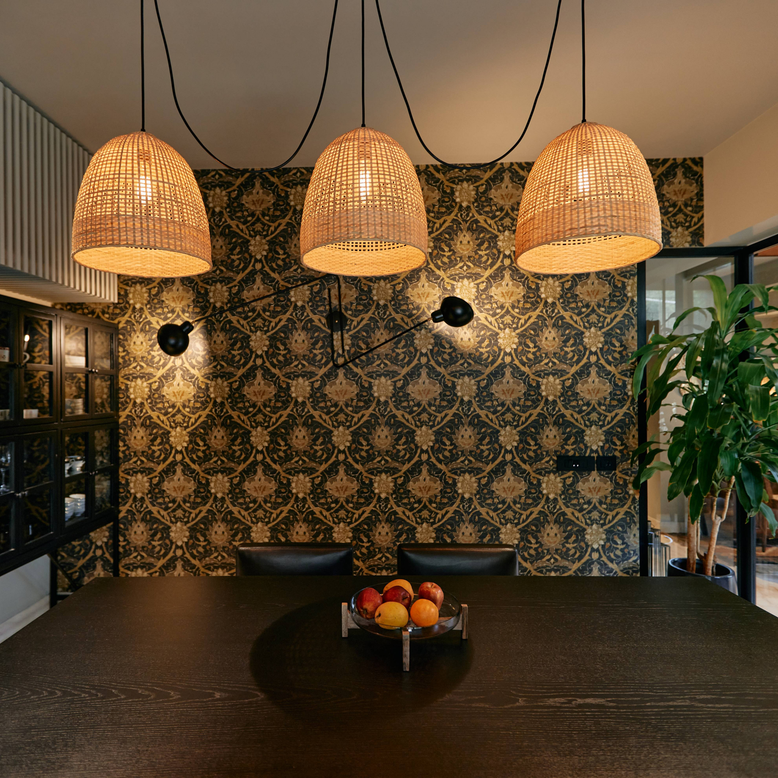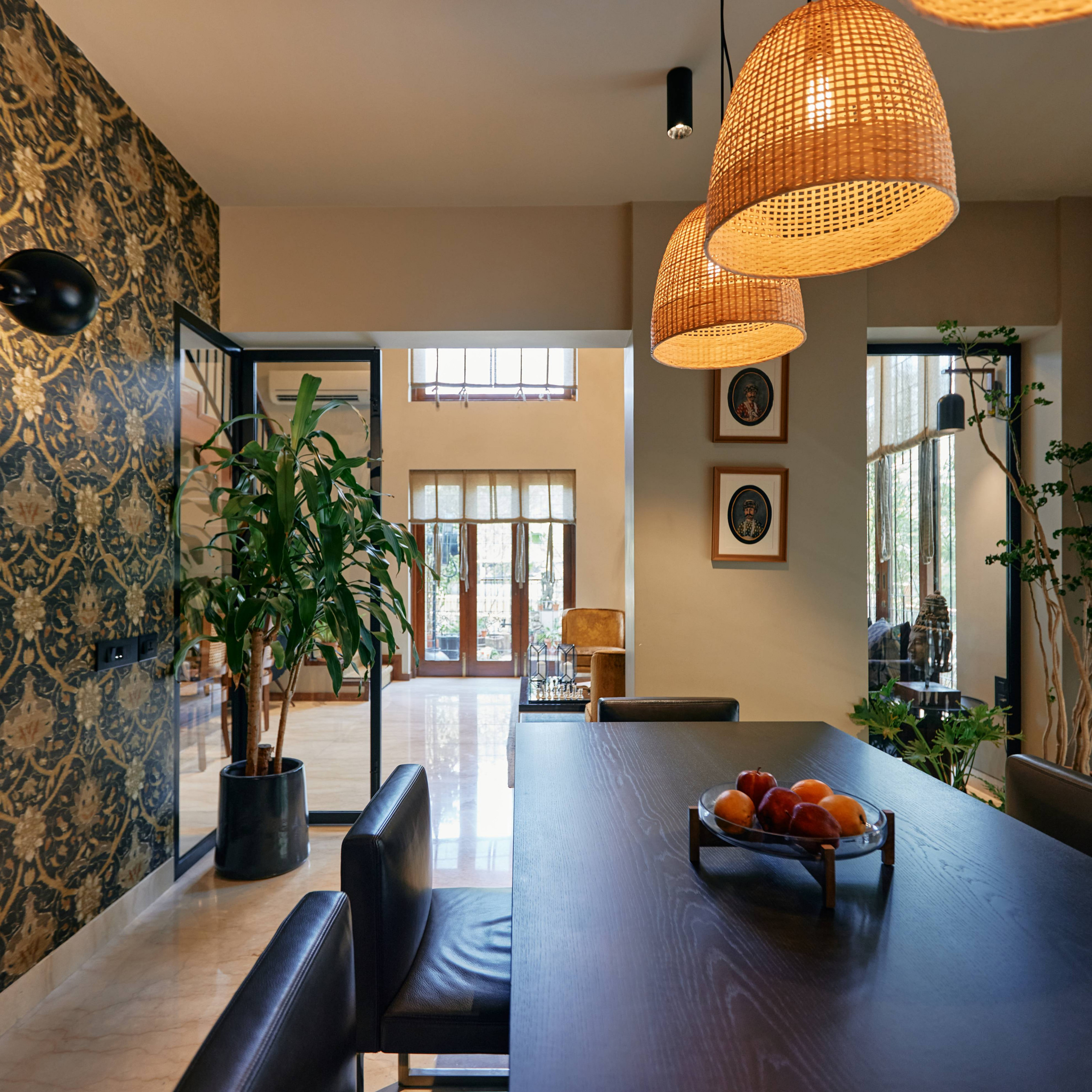 A semi-open walled partition separates the dining room from the living area. The rectangular table and matching black chairs project an understated presence juxtaposed with the nature-inspired, arabesque-style wallpaper.