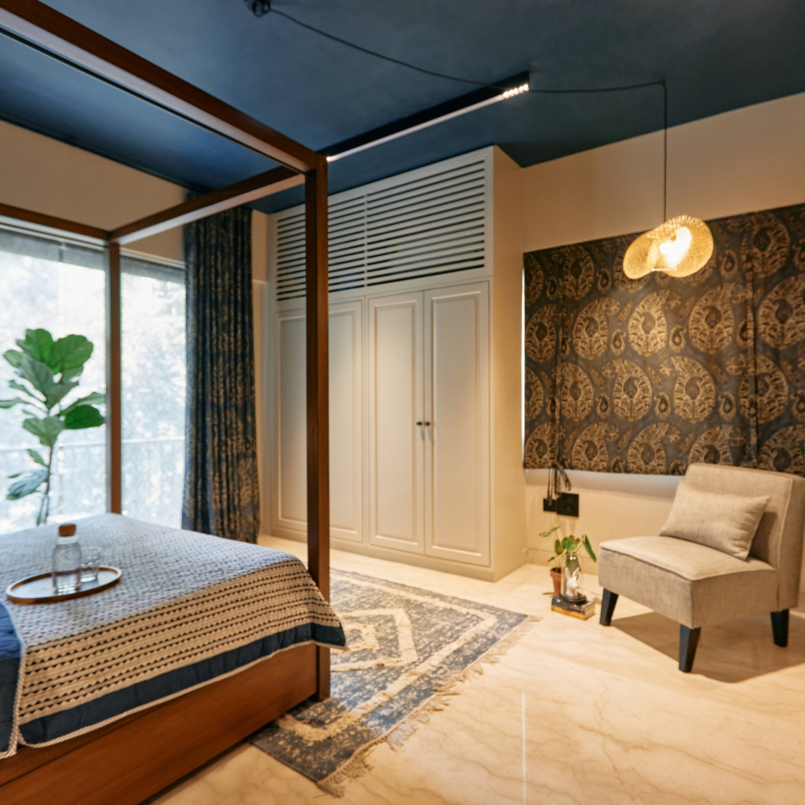 The second bedroom flips the conventional design rule book with an indigo ceiling and white walls. The white cabinetry melds into the walls, while the solid-wood four-poster bed provides an earthy offset to the contemporary scheme.