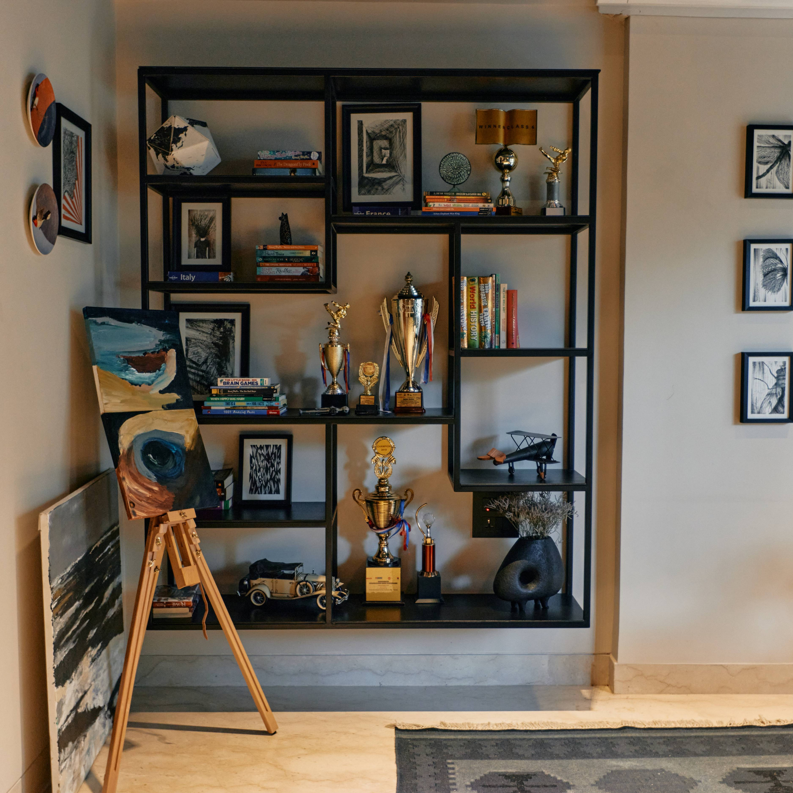 A black open shelving unit, home to trophies and tchotchkes, defines one wall.