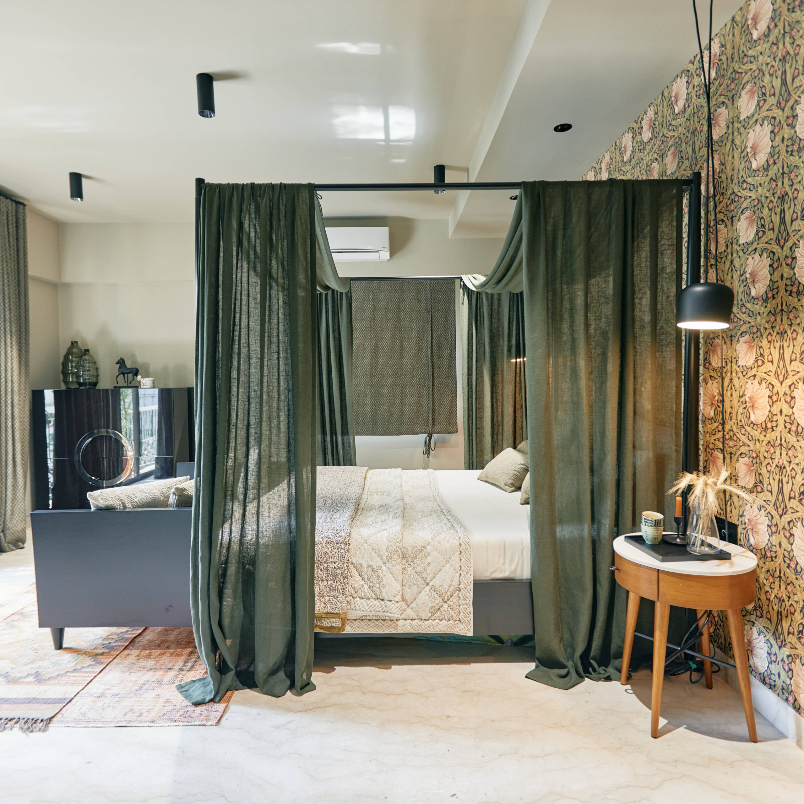 “The soft green canopy over the four-poster bed beautifully complements the wallpaper. The combined effect helps create a whimsical, dreamy feel,” Kaur says.