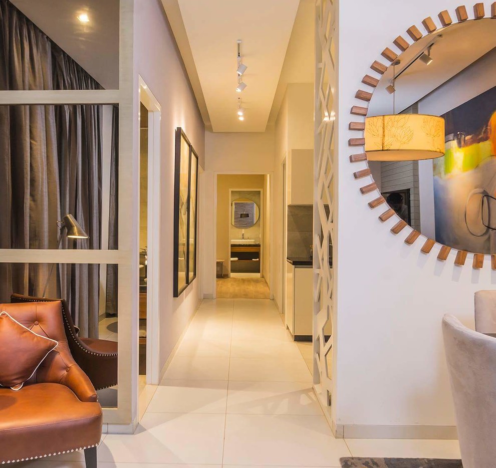 A passage behind the living-cum-dining room opens, from right to left, to the kitchen (which is open to the passage), the master bedroom and bathroom, the guest bedroom (straight ahead) and the guest bathroom. The wall along this space is awash in ash grey. To accentuate the passageway and to give it an illusion of height, two large framed prints hang side by side. The subtle illumination by spotlights creates a calm, subdued ambience in this area.