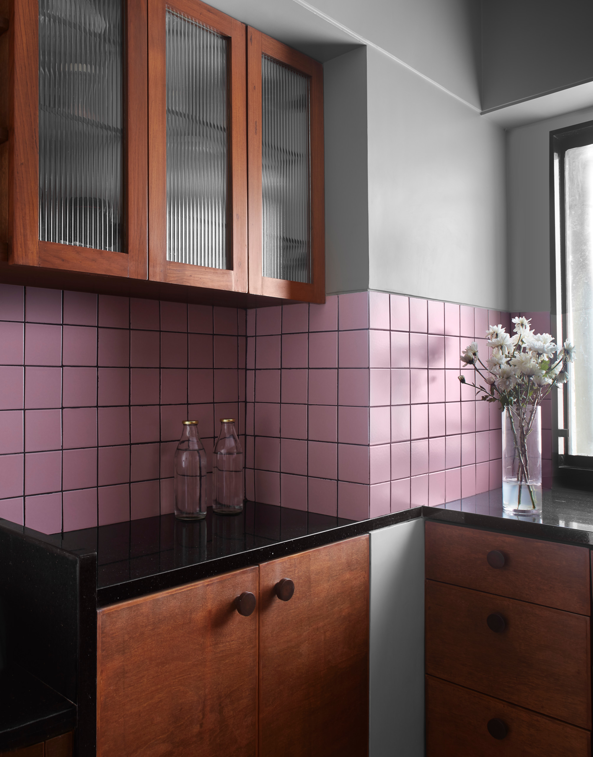 Clad in square-patterned tiles, the backsplash adds depth to the decor and echoes the hushed pink hues of the flooring. The brown wooden cabinets and black granite counters provide neutral respite.