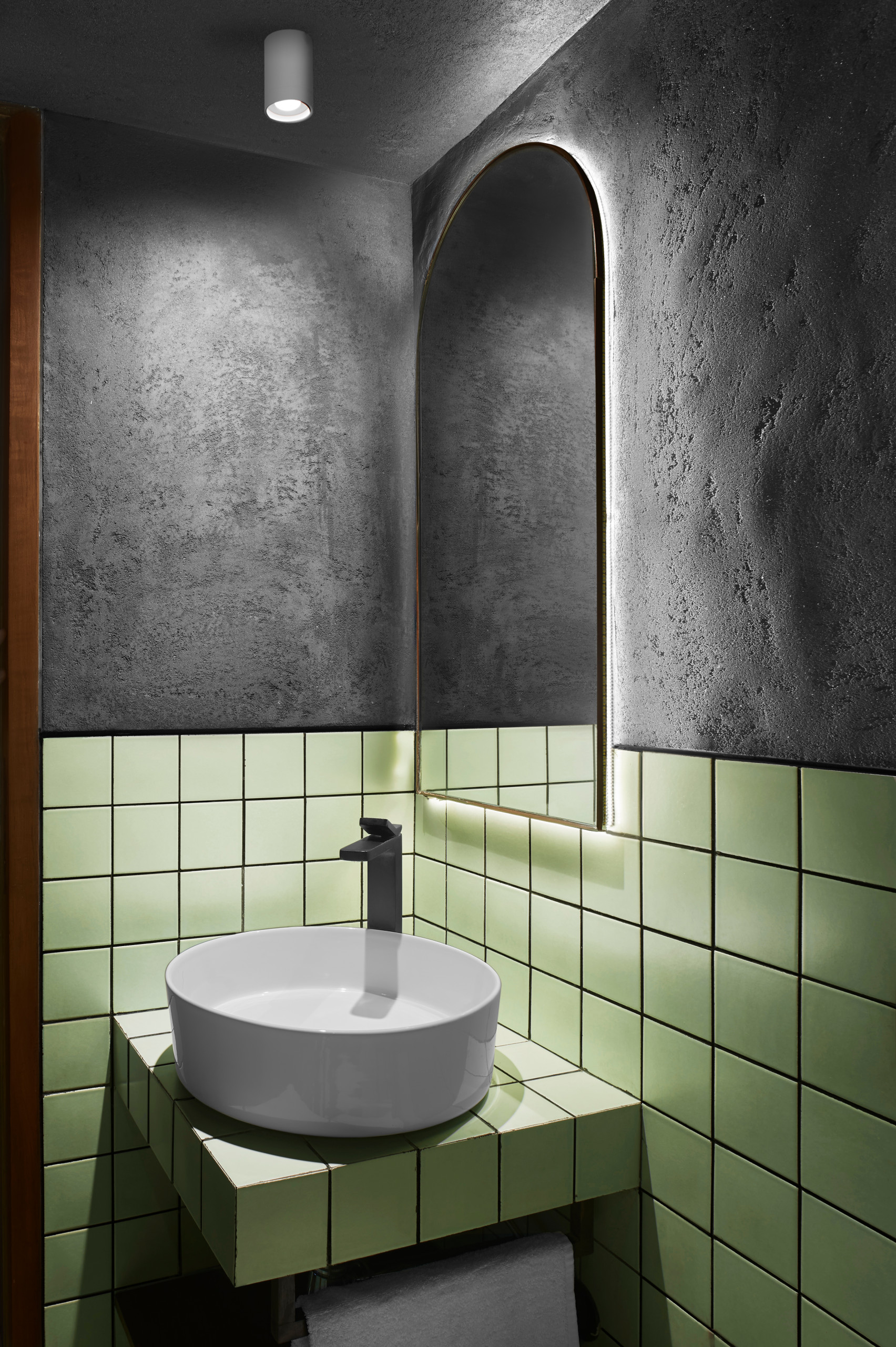 In the dual-toned master bathroom, green tiles provide a burst of freshness and balance the steel-grey micro-topping on the upper wall and ceiling. Ambient lighting from the recessed LED strip lights behind the mirror softens the mood.