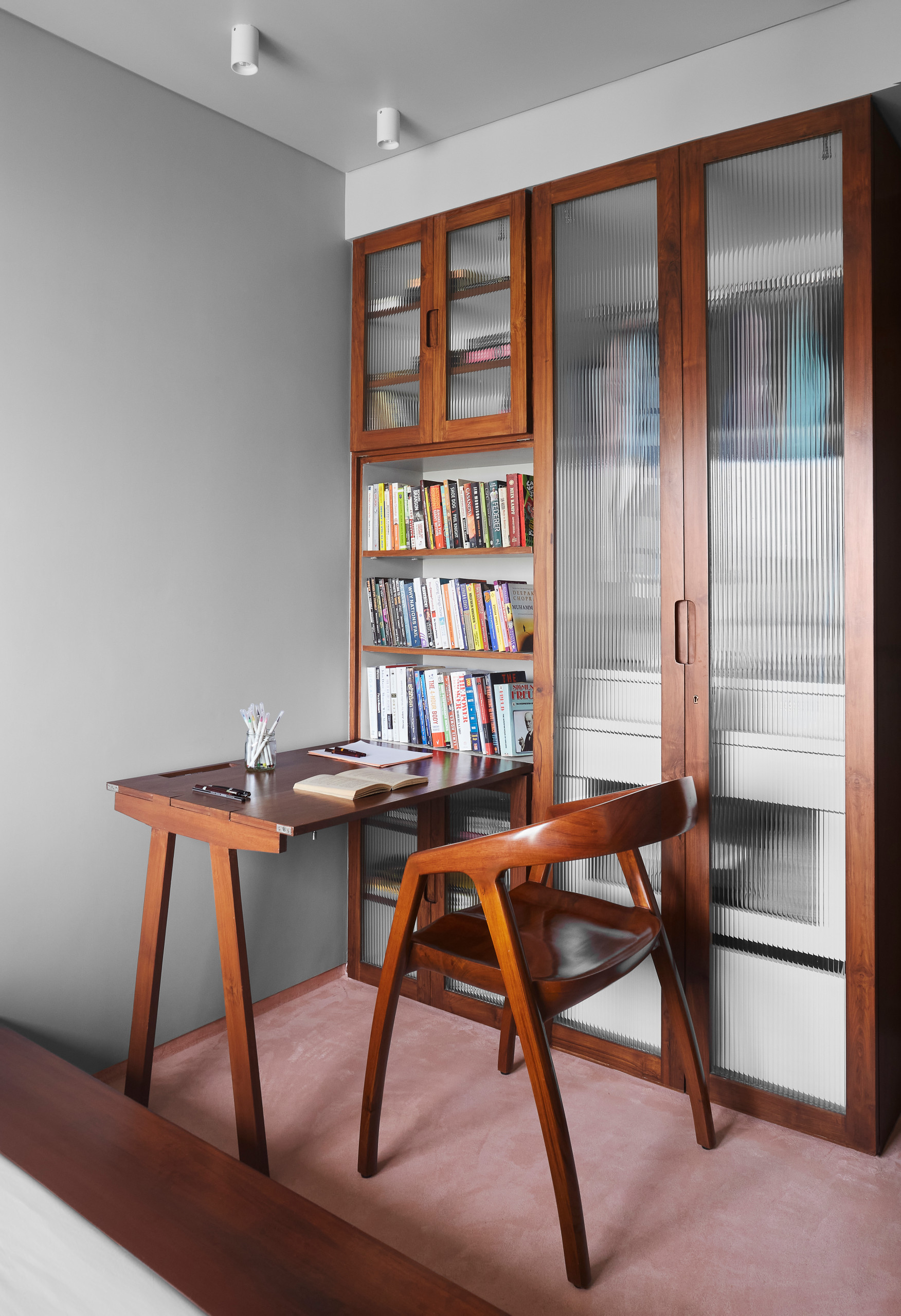 Made of fluted teak, the wardrobe shutters have a slatted design which draws visual interest and gives an illusion of height. Complemented with custom-made semi-circular rosewood handles, the wardrobe adds character and personality to the room.
