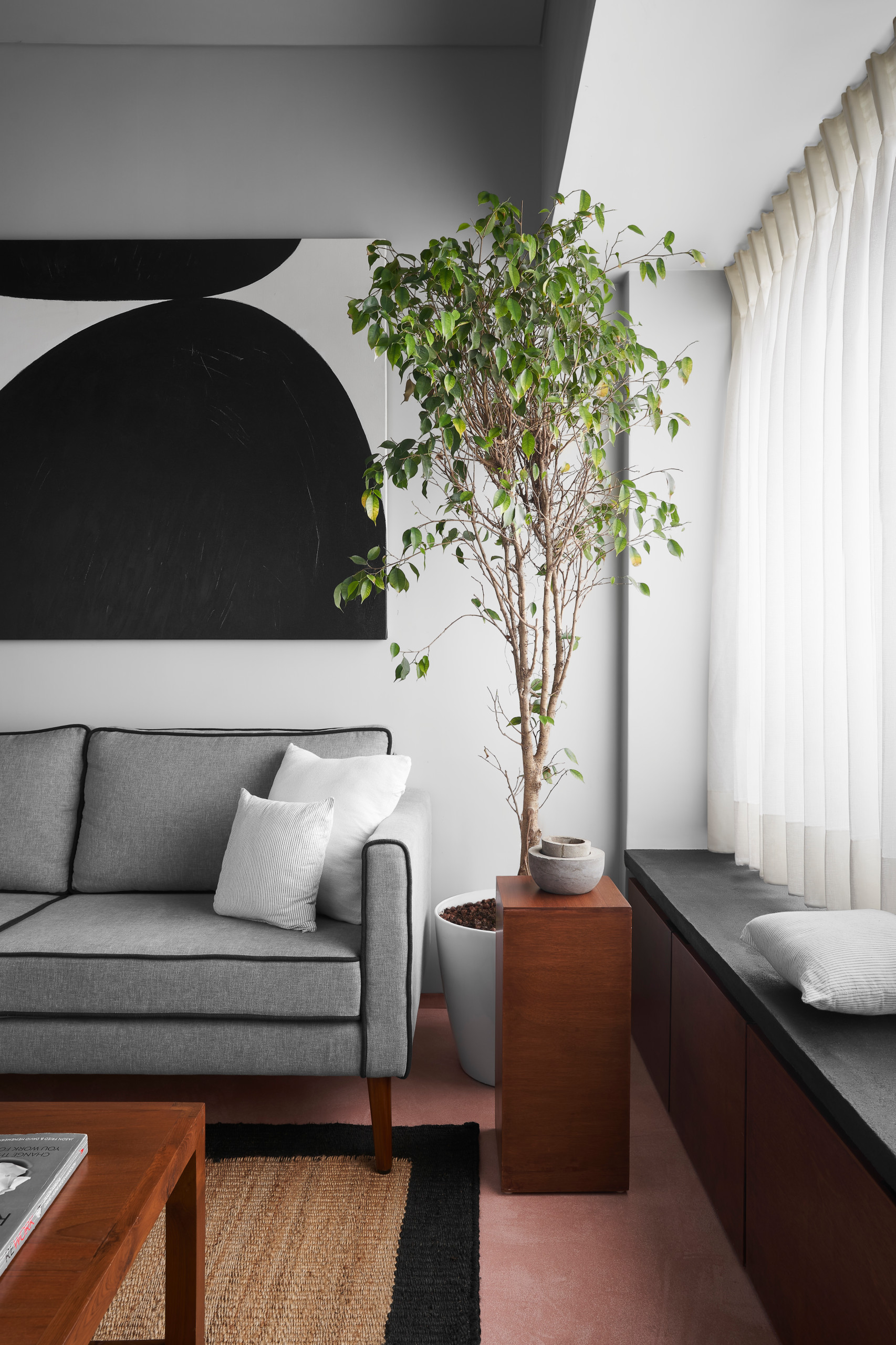 An abstract artwork in monochrome hues and a tall ficus plant with its spreading canopy add to the pared-back look in this area. The black-bordered hemp rug accentuates the colour palette and ties the disparate materials together.