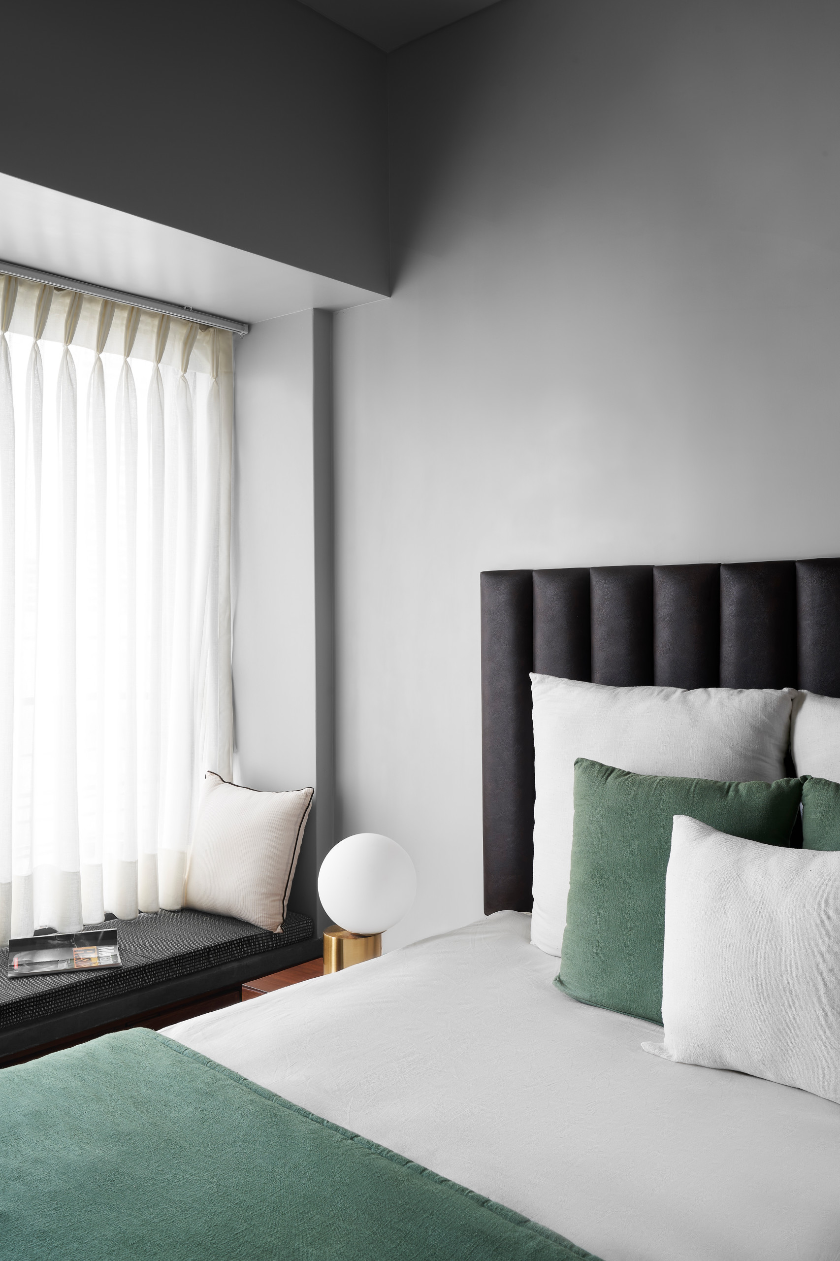 A built-in window seat steals the attention and extends along the complete width of the master bedroom.