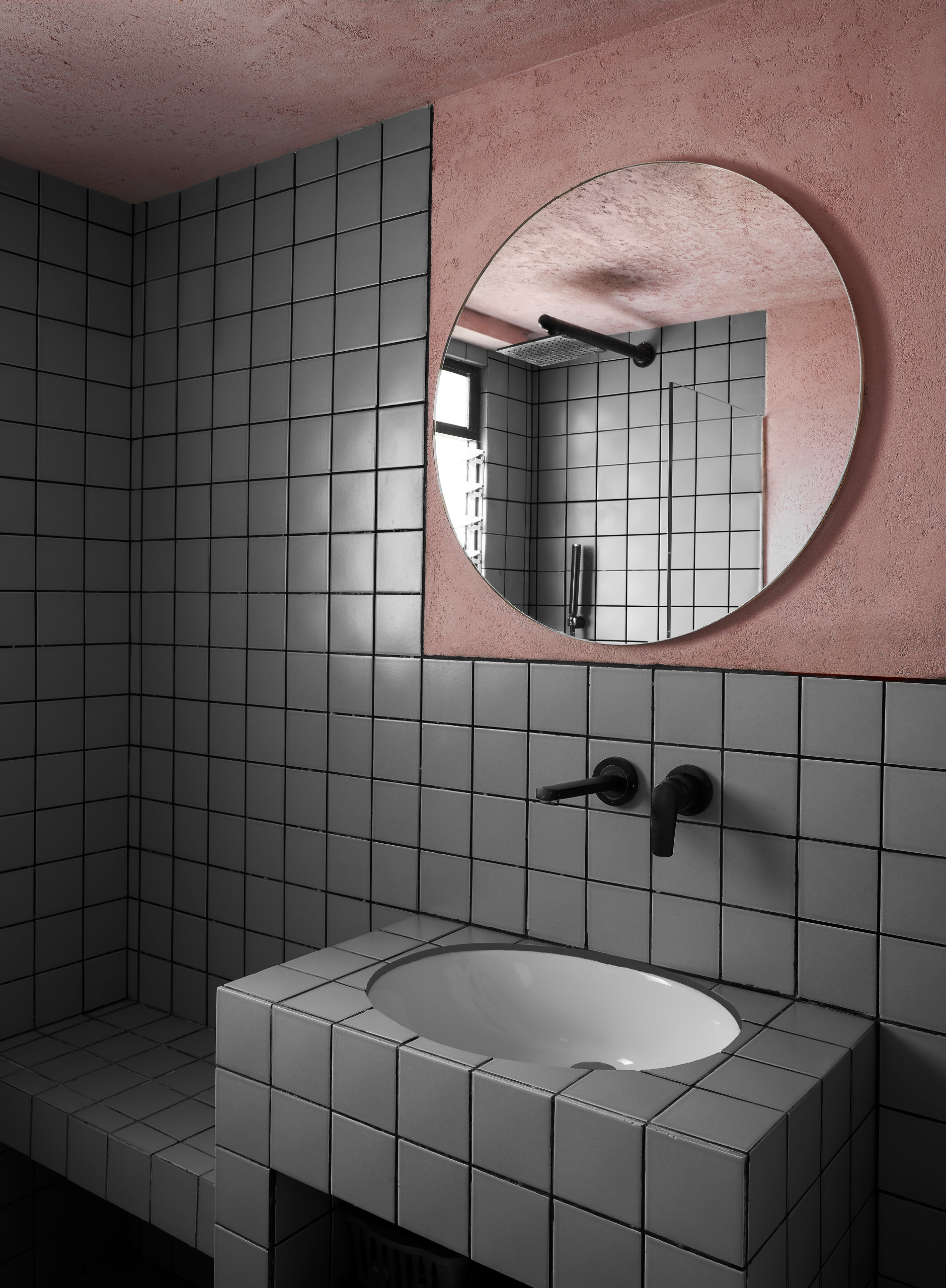 This bathroom reiterates the recurrent pink-and-grey colour scheme used across the house. Square grey tiles used in the walls, shower area and built-in bench contrast with the soft pink hues behind the mirror and ceiling to bring in layers of tone and texture.