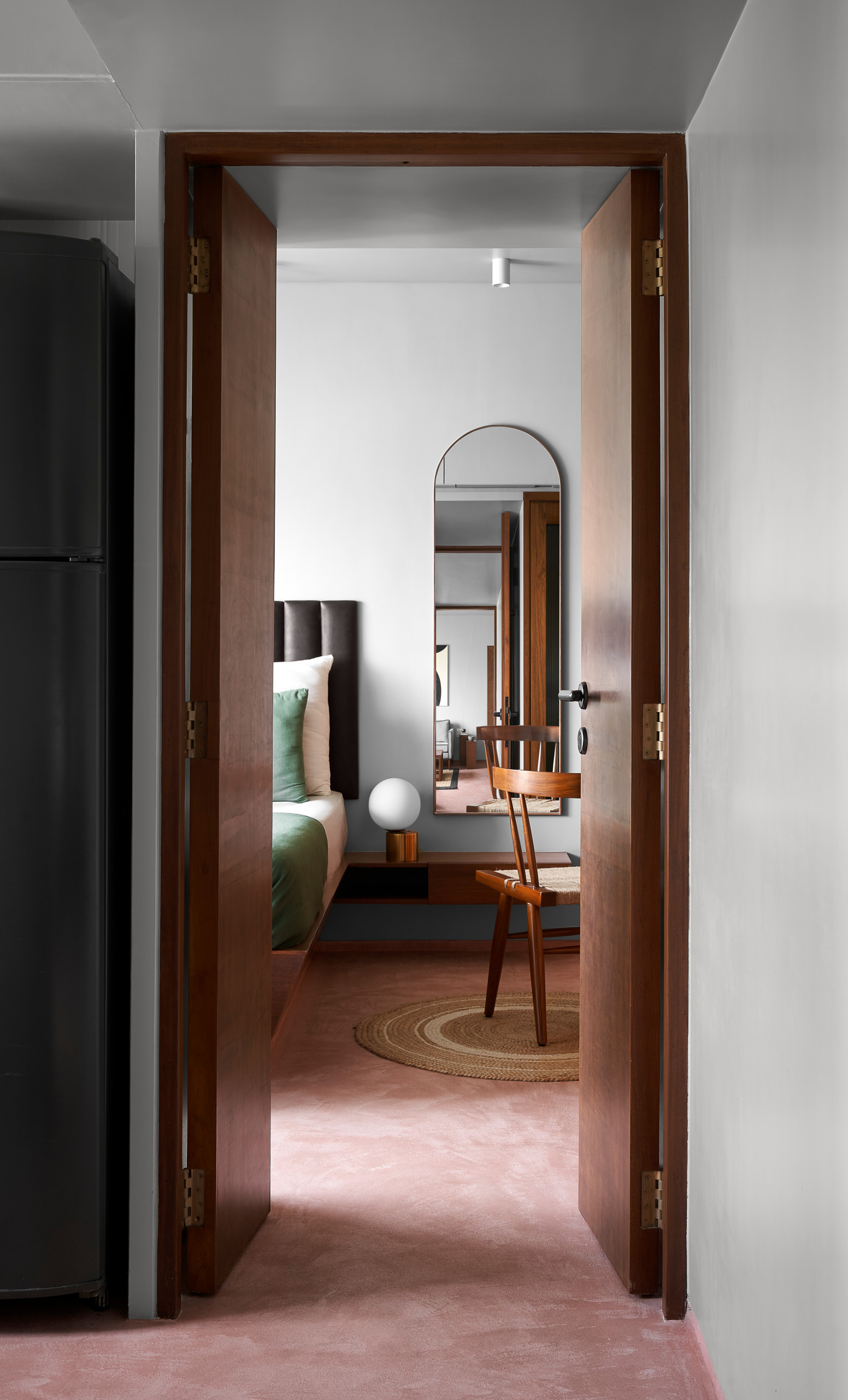 At the forefront of the living room is a Chandigarh chair, the classic mid-century chair designed by Swiss architect Pierre Jeanneret and made from reclaimed teakwood and cane. Grey walls and a sofa with black piping offset the richness of the wood while the striking muted pink flooring injects a dose of ruggedness.