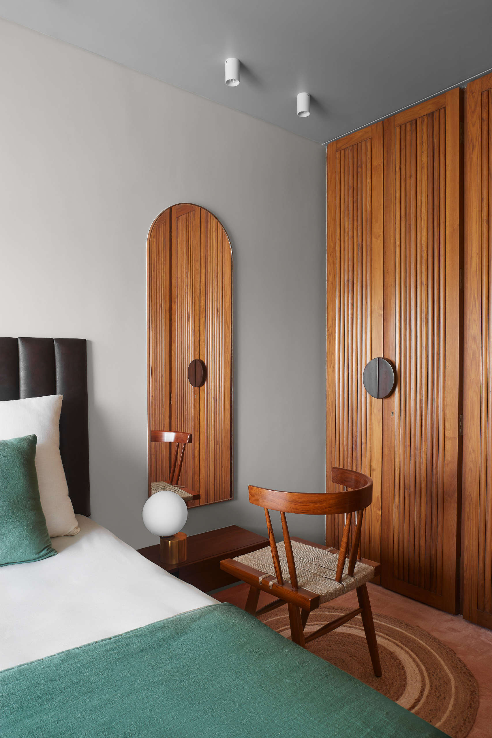“The complete width of the master bedroom has a floor-to-ceiling wardrobe. In front of the arched dressing mirror, next to the bed, is a chair in teak and rope made by the master George Nakashima,” says Lalan.