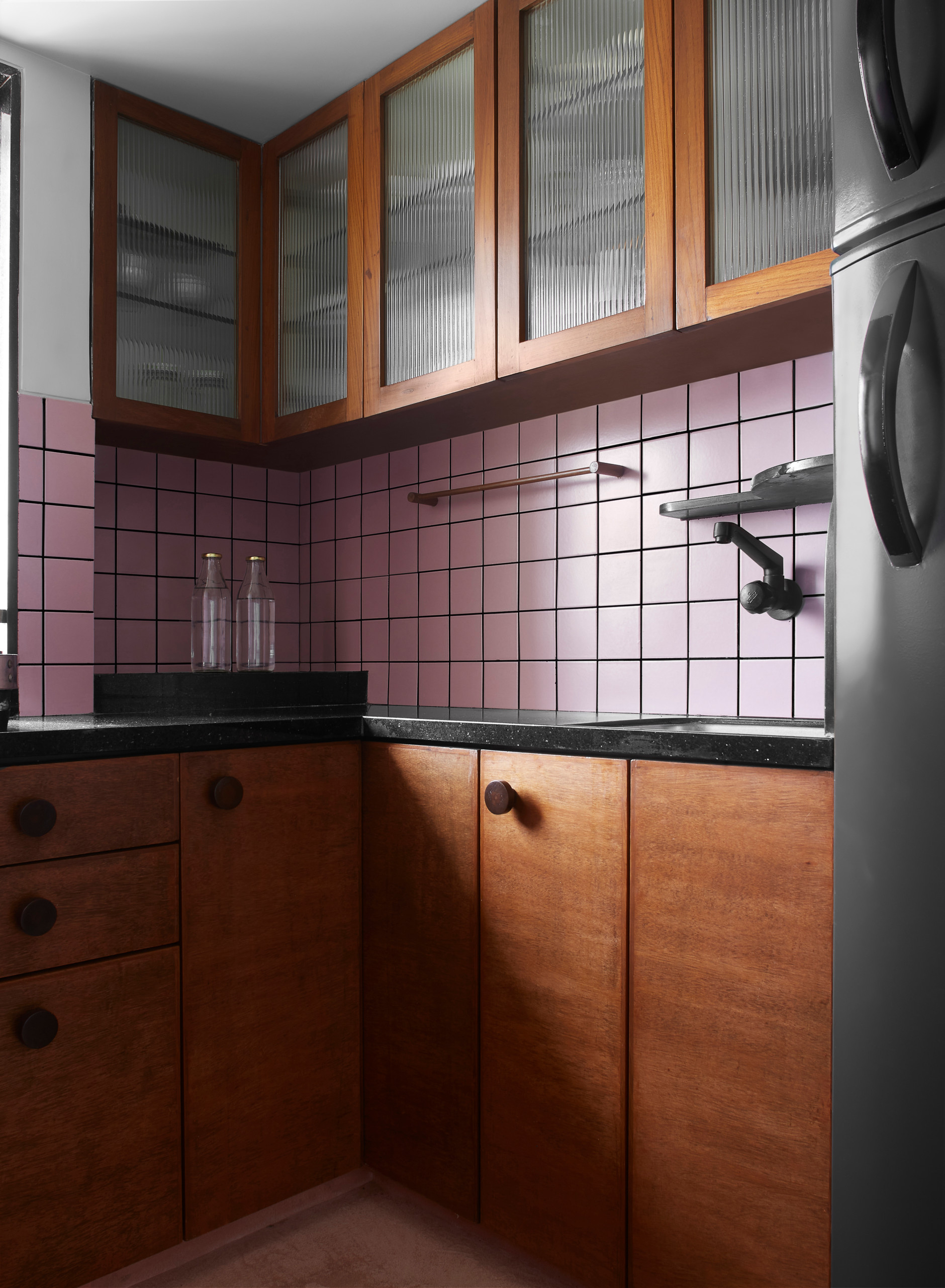 One can enter the kitchen from the living room. The cabinet frames are made of teak with fluted glass infills. Exposed plywood panels with rosewood knobs enclose under-counter storage.
