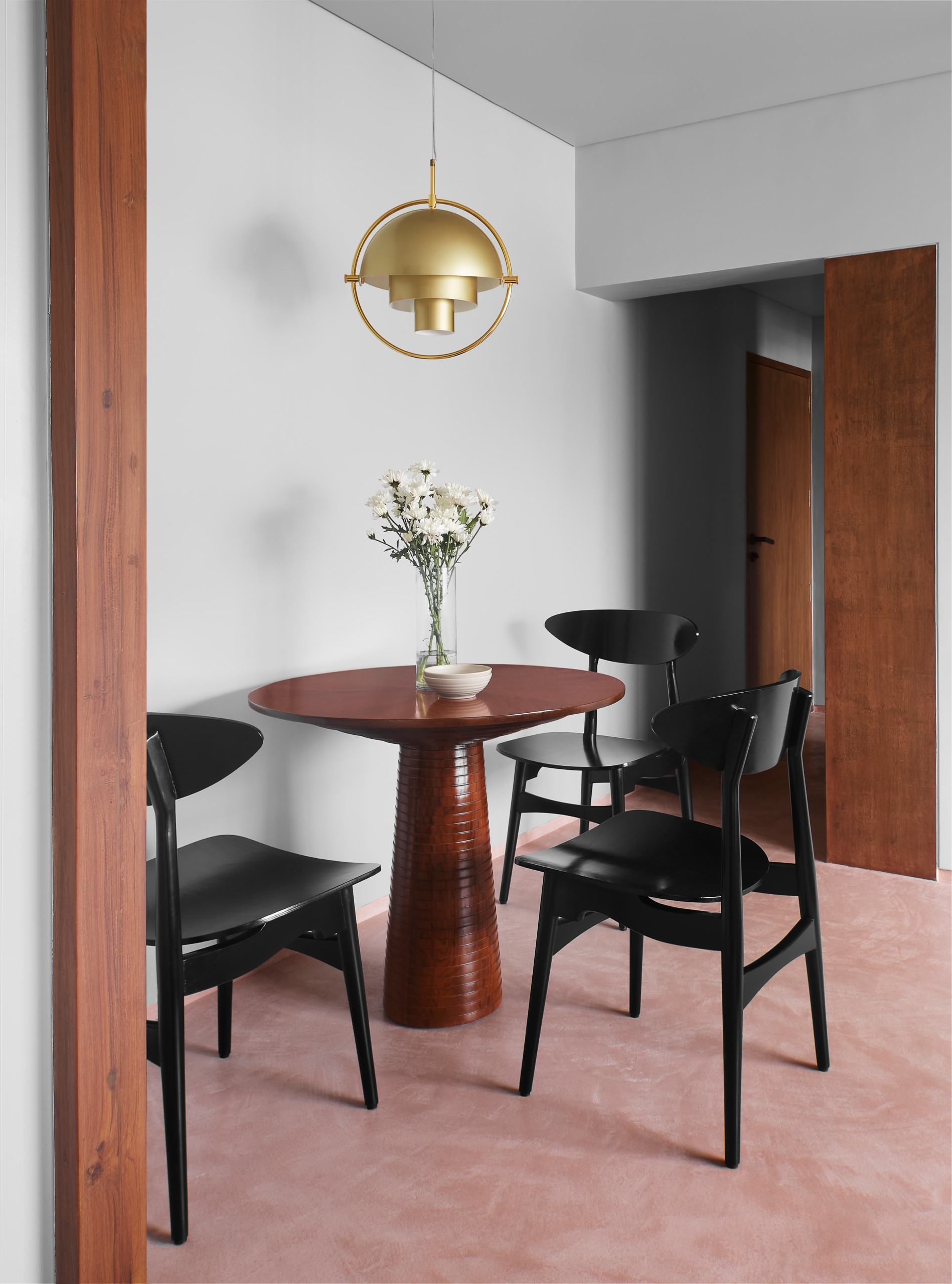 The dining area comprises a circular table and three mid-century chairs by Hans Wegner. A suspended brass pendant light brings a touch subtle drama.