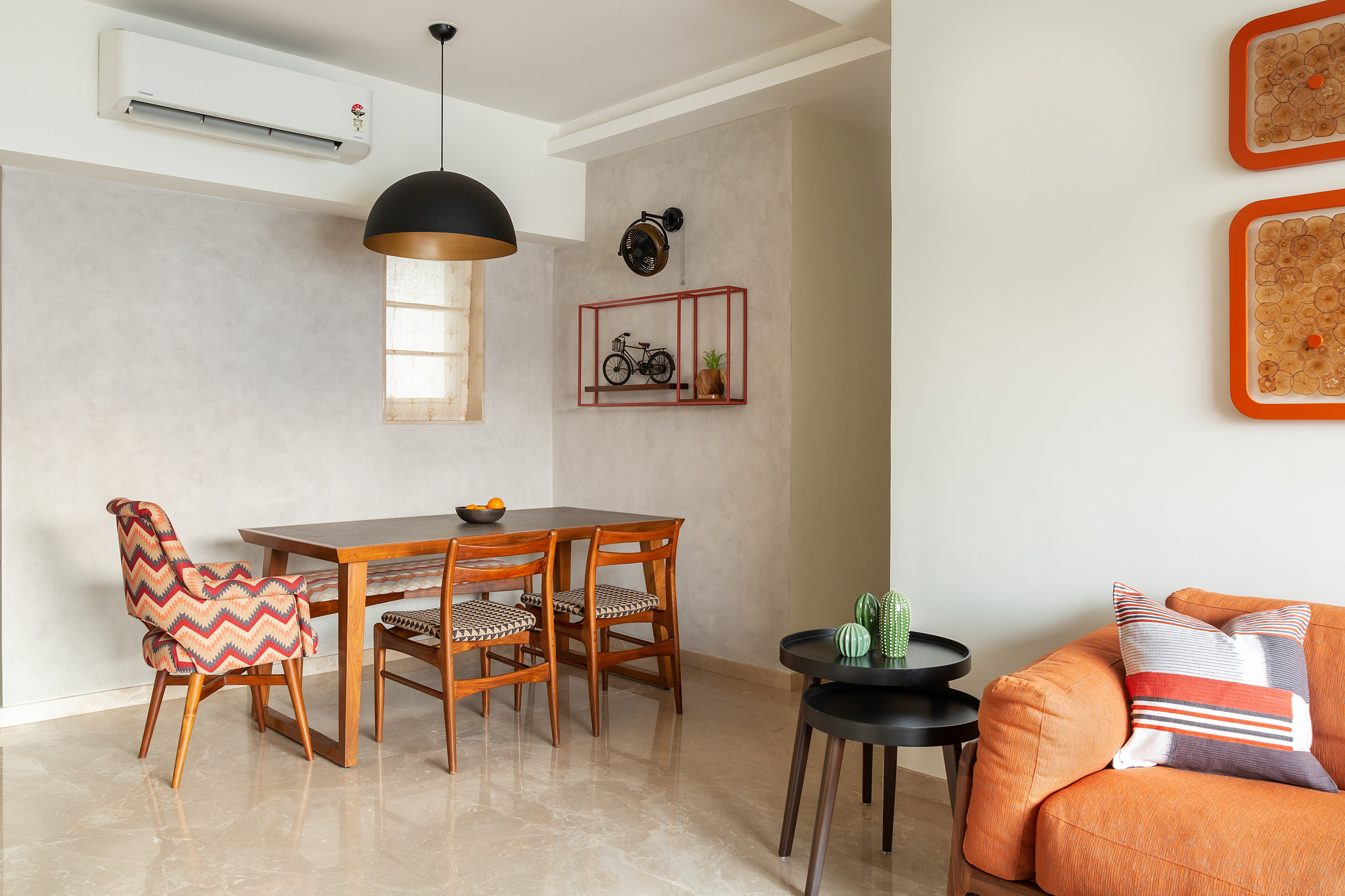 “With its dropped scale, a dramatic black dome light gives a sense of intimacy to the dining area. The table, chairs and bench are customised with playful red and orange patterns – complementing the artwork that flanks the dining table. The textural wall provides continuity to the material story,” says Mehta.