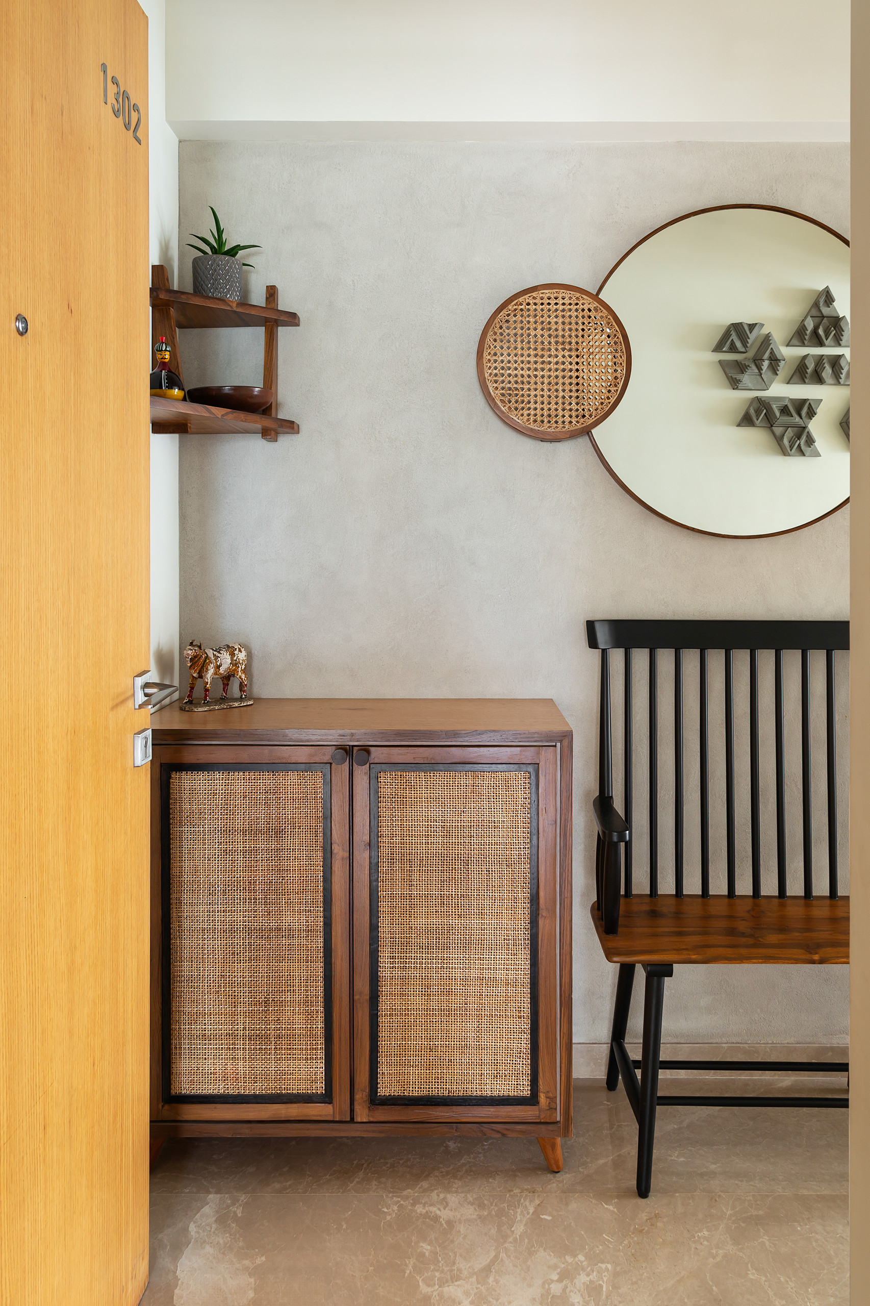 This apartment in Vikhroli is cocooned in a variety of materials and textures brought together by the subtle hues prevailing throughout. The main door opens into a foyer with a custom shoe cabinet made of wood and hand-woven cane, which brings in texture and a touch of mid-century charm to the spot.