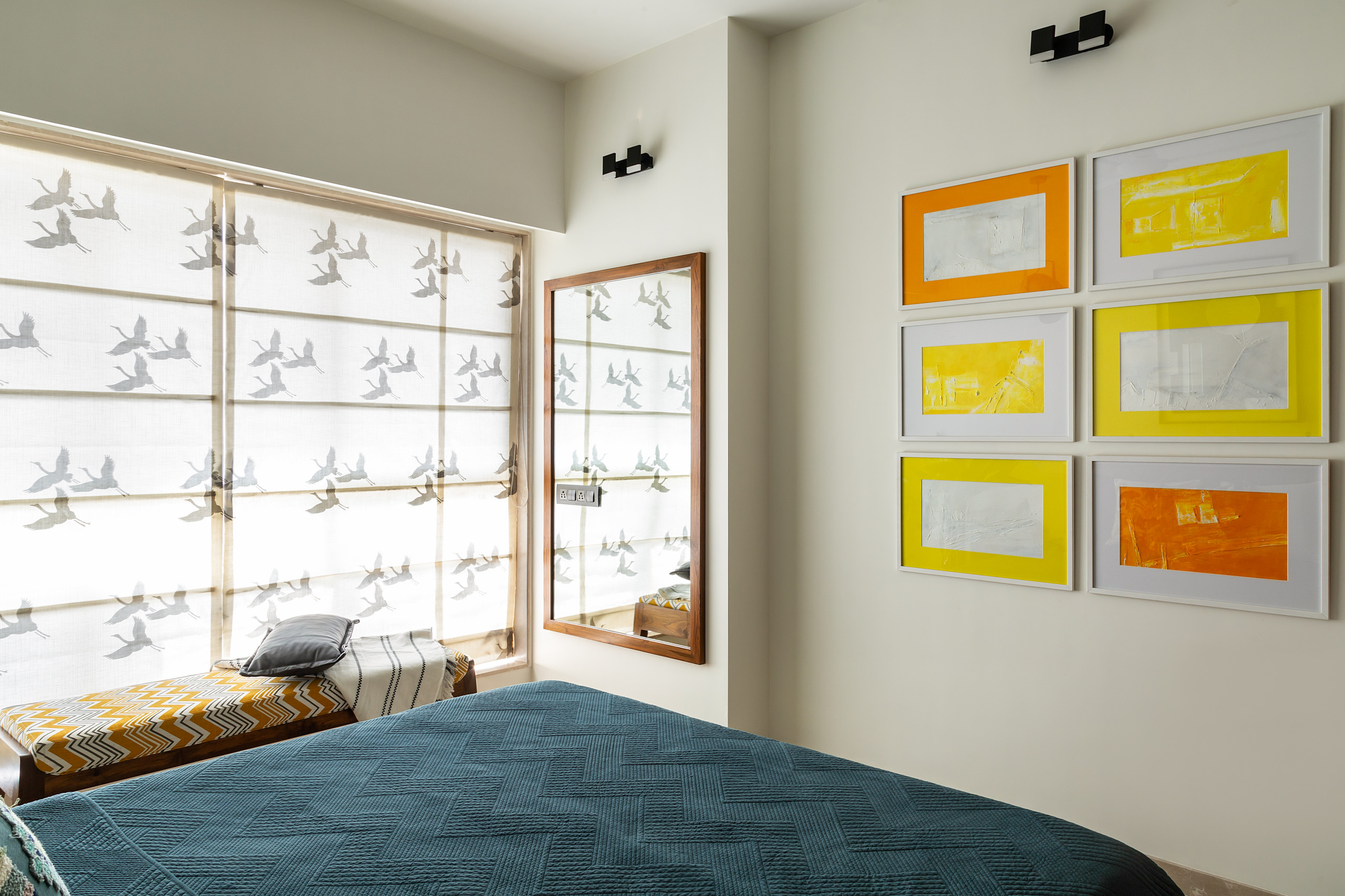 An interesting interplay of light and shadows fills the room through the patterned window blinds. The dark blue of the bed and vibrant colours of the picture frames and the bench create an lively interplay of contrasts and patterns without clutter.