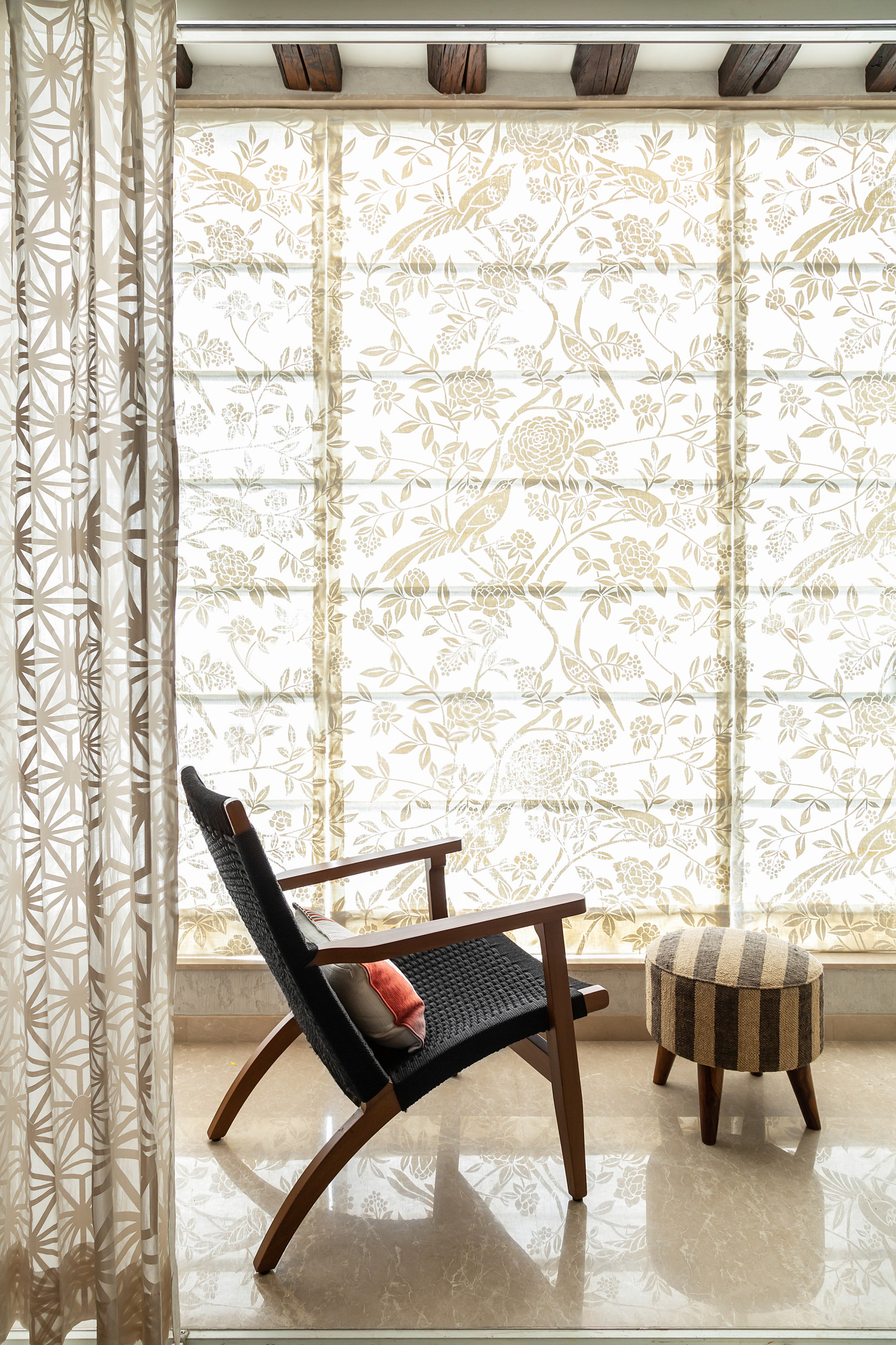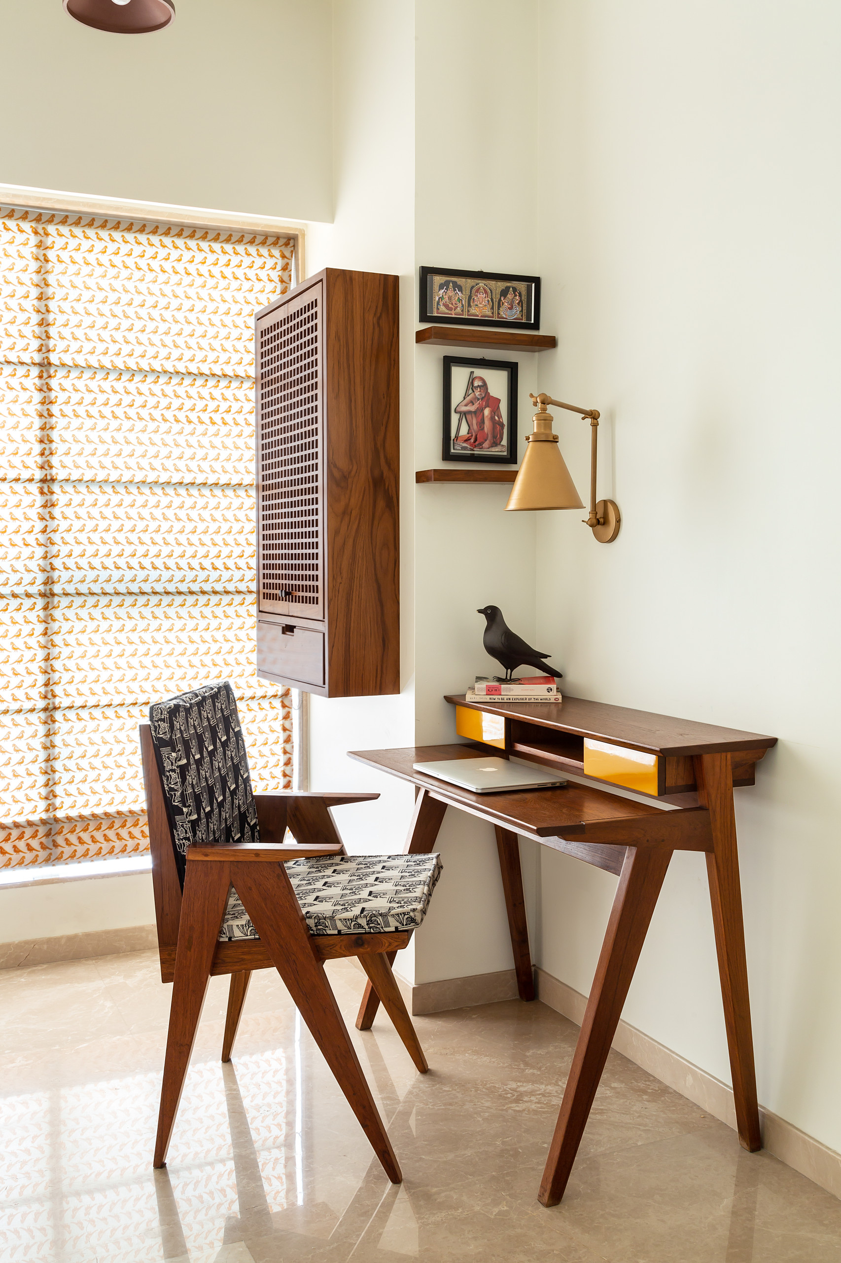 The daughter’s room, which doubles a study, features a Baro desk and chair. A wall-mounted custom puja cabinet shows how to make the most of the space taken by load-bearing columns. The blinds, patterned with little yellow parrots, are from Russell Street.
