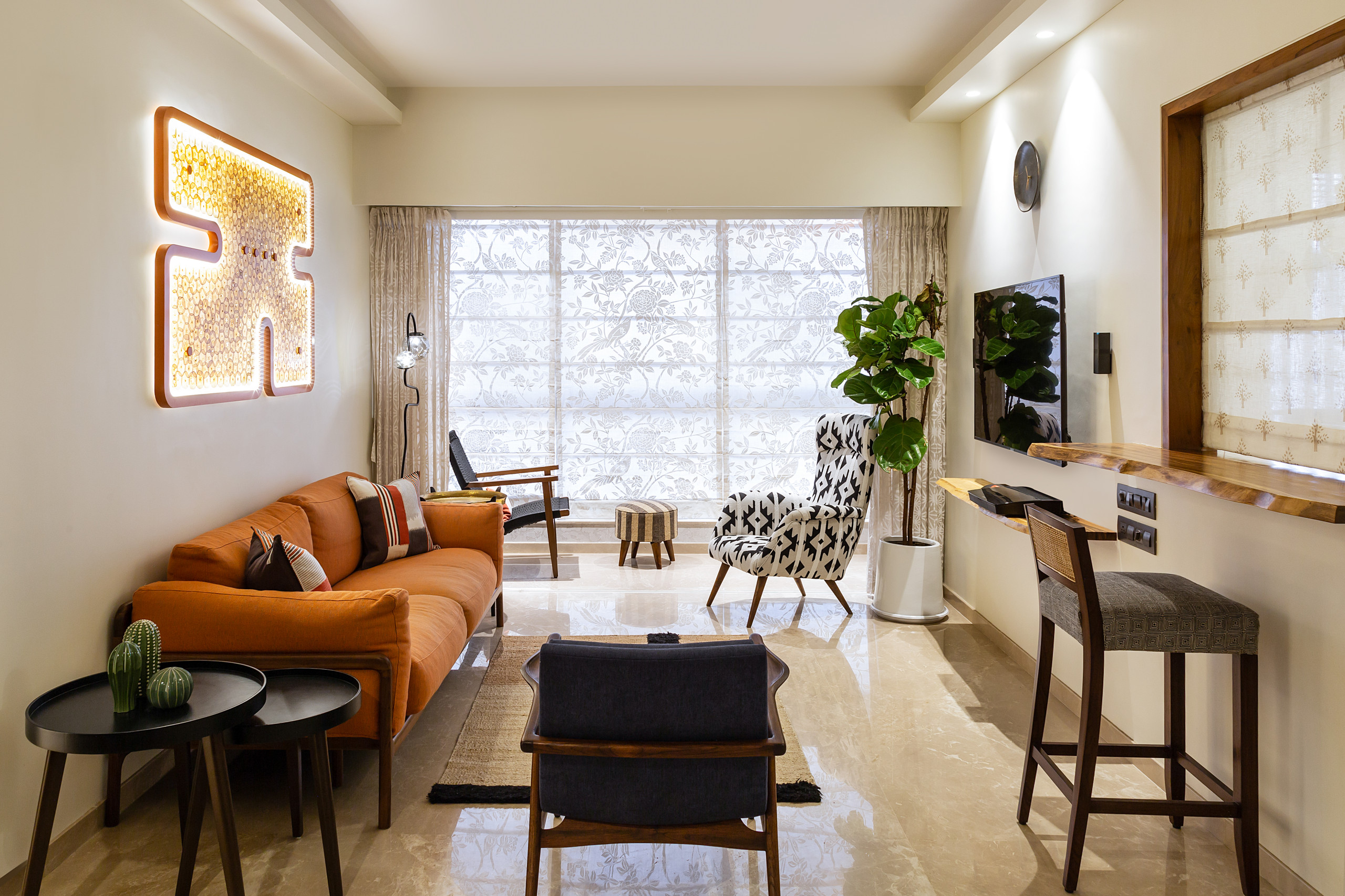Patterned blinds allow light to filter in softly through the day. The faux ceiling with recessed cove lighting adds depth to the decor. Layered tones of muted orange in the artwork and sofa add depth and vitality to the otherwise minimalist living room.