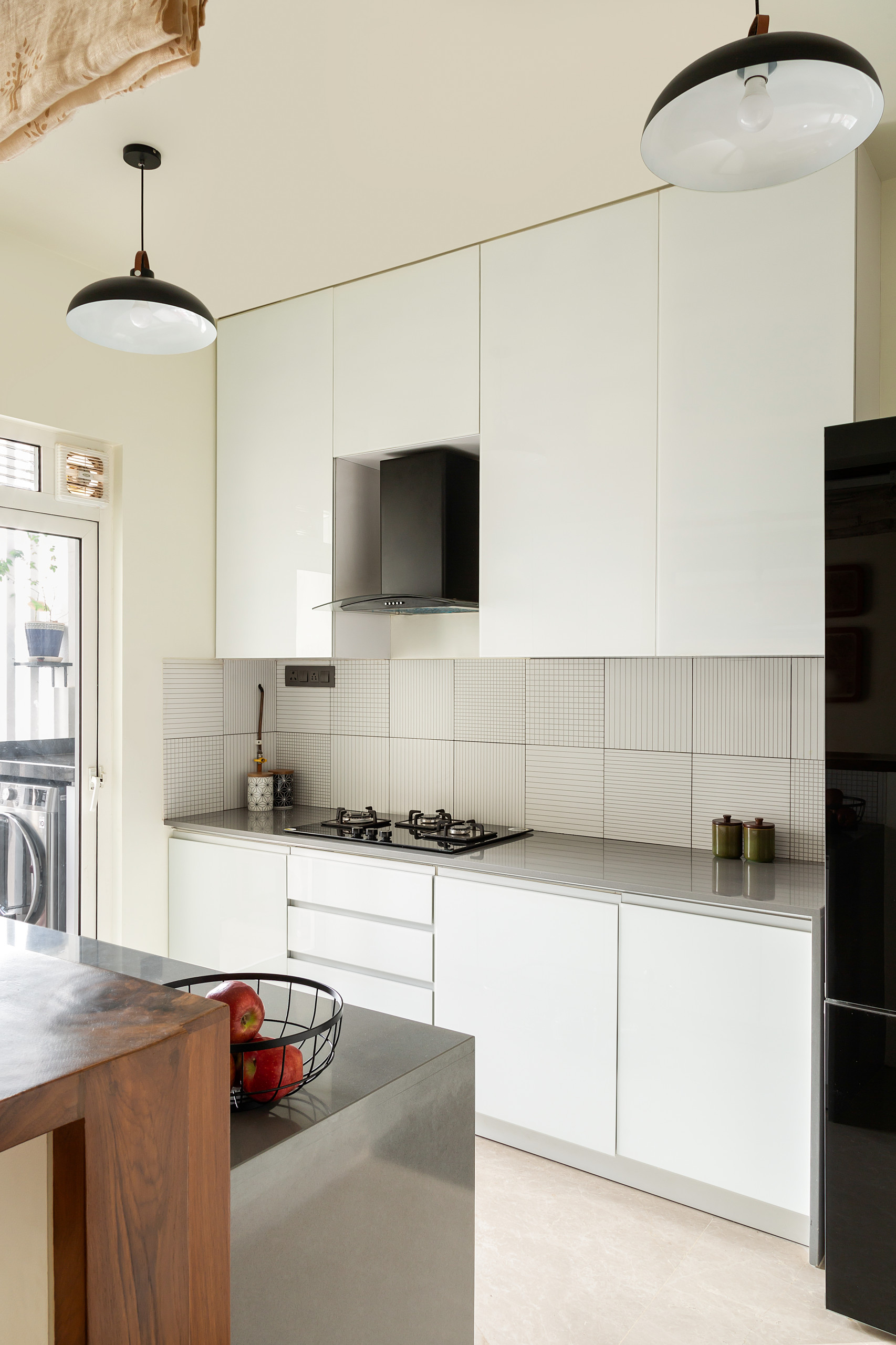 The kitchen connects to the living room via a service window framed in live-edge wood and through transparent glass doors. Live or natural edge is a term used to define wood that has been sliced off a log and the natural, uneven edges left as they were. A backsplash of custom-printed tiles with scaled grid lines offsets the plain white cabinet shutters.